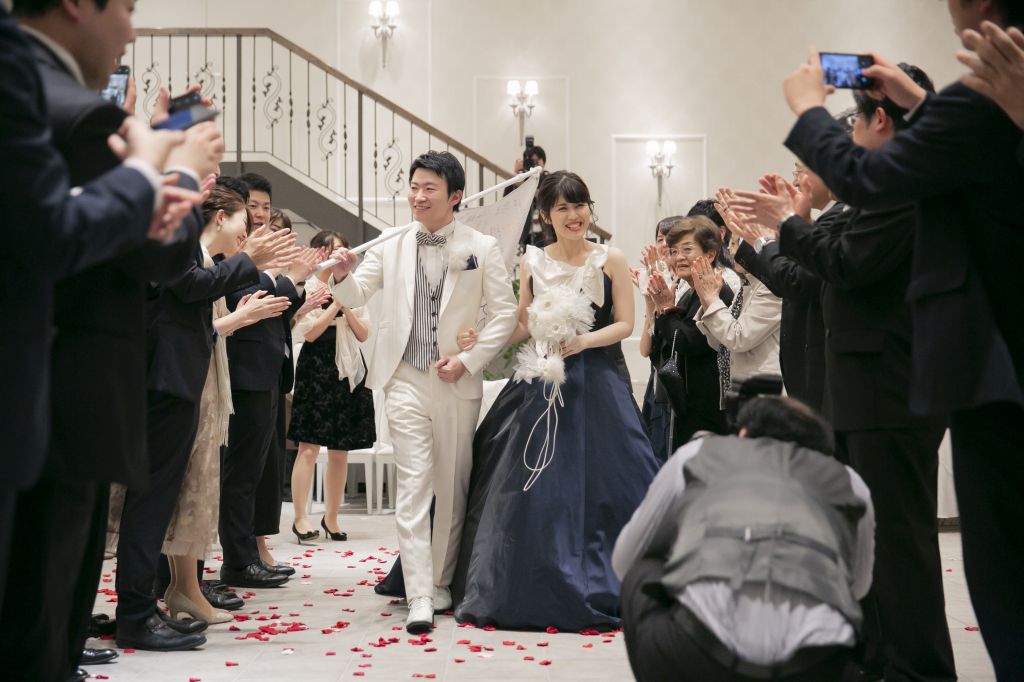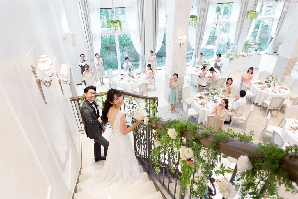 楽しい雰囲気の中入場されたい場合は、ゲストも手を振りたくなるような、「賑やかで盛り上がるBGM」を、階段などから登場して、ロマンチックに入場されたい方は「しっとりとしたBGMや、ピアノ生演奏」が良いですね。