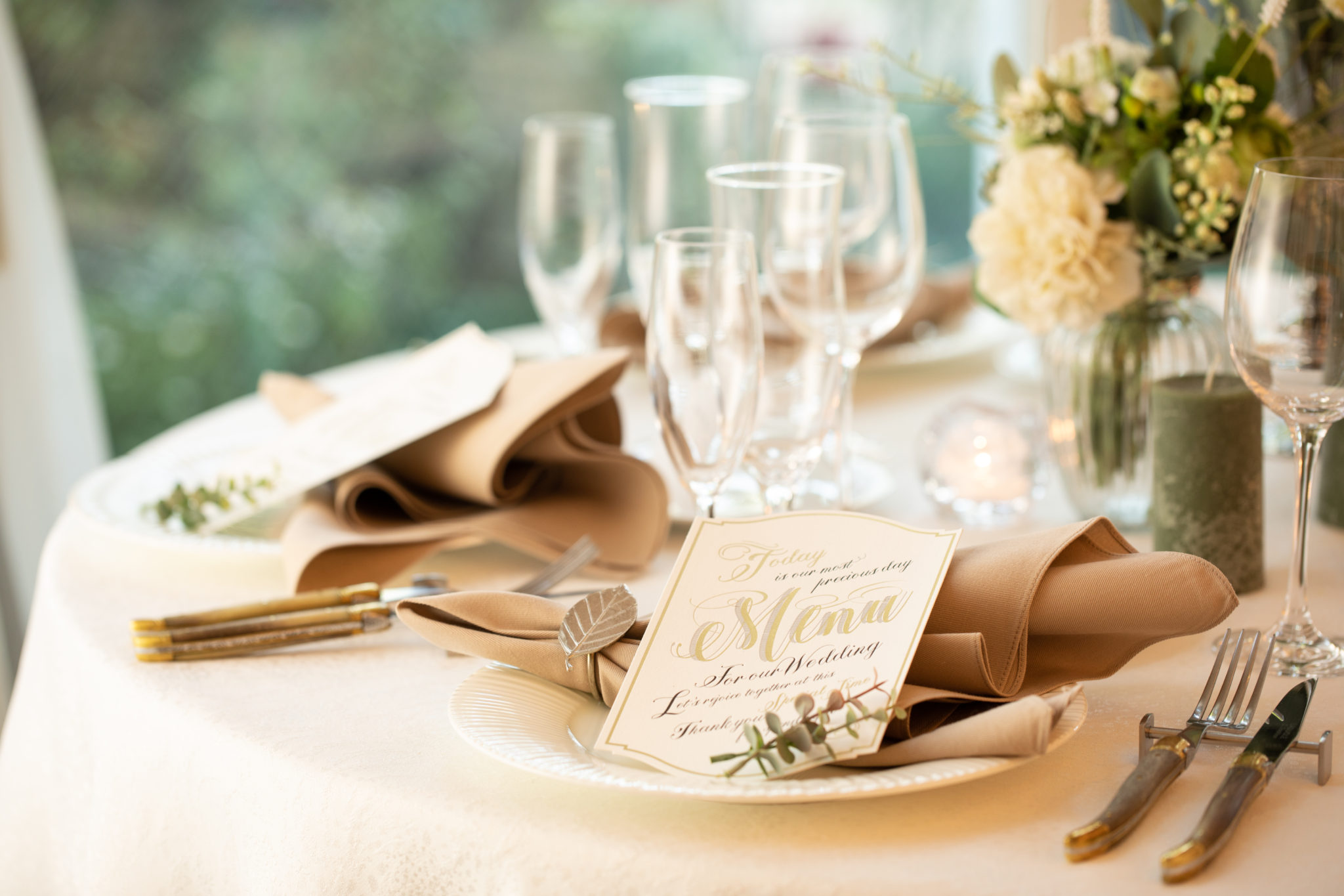結婚式のテーマや会場の雰囲気にあわせてペーパーアイテムを選びましょう。プロフィール付きの席次表や、席札の裏にサプライズメッセージもおすすめです。