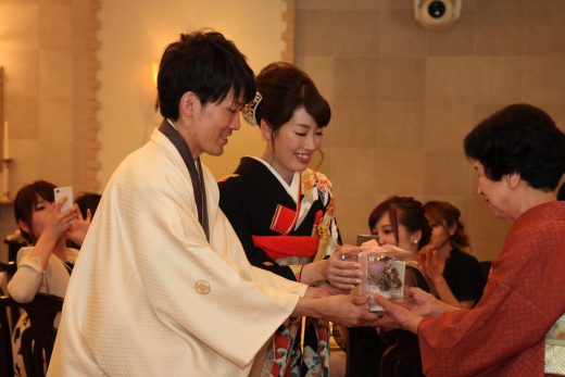 結婚式の衣裳を考えるとき「結婚式で着たい!」と思われた振袖が麻友子さんにはありました。それは、成人式の時に大好きなおばあ様から贈られた、思い出の振袖でした。ご結婚式当日、77歳の喜寿を迎えられたお祝いに、おばあ様の大好きなお花と「ありがとう」のお気持ちを贈られました。おばあ様の思い出の振袖を着る夢が叶い、その姿をとっても喜んでくださいましたね。
