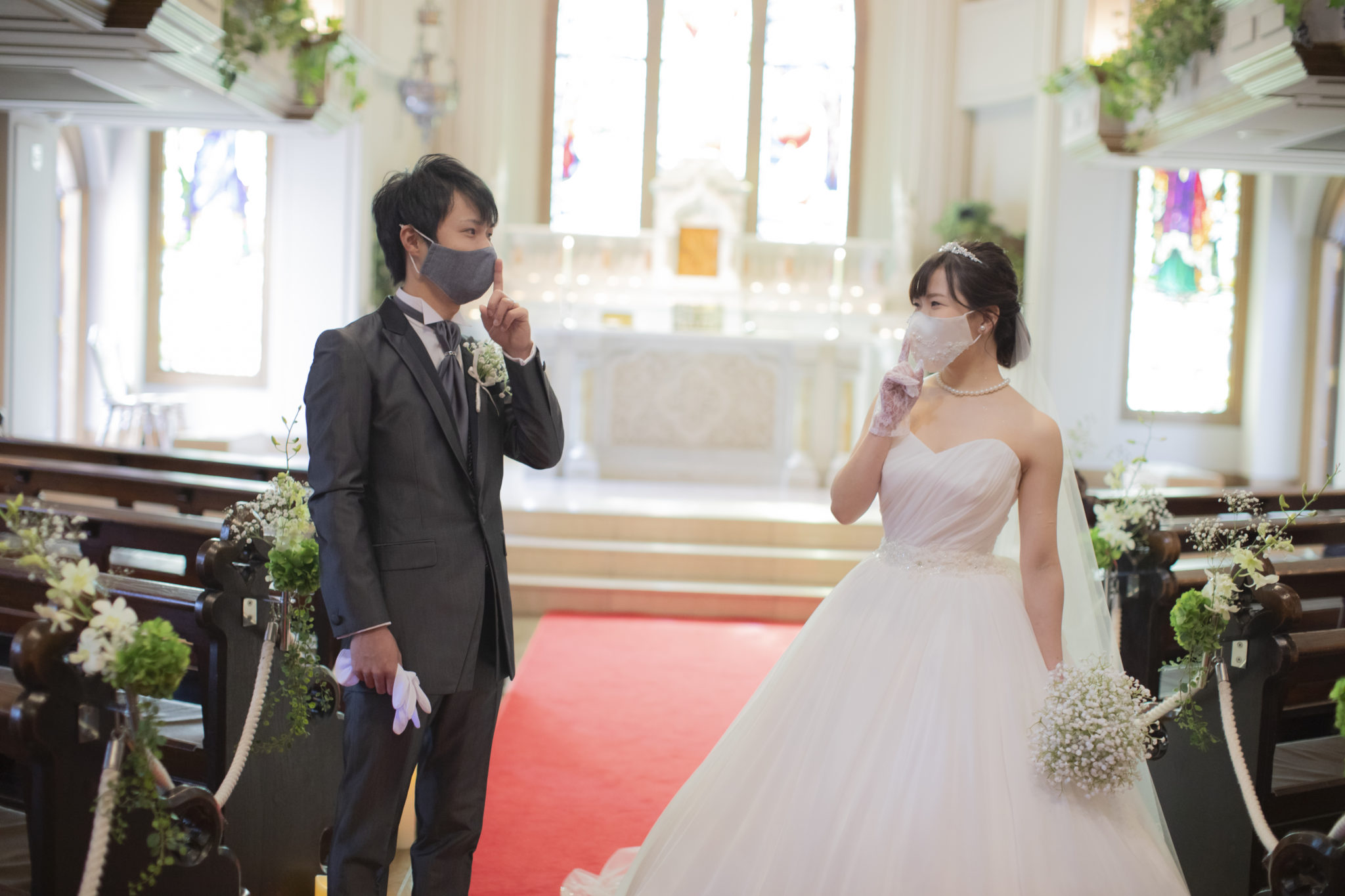 聖ペトロ教会では、おふたりの選ばれる衣裳の色や素材に合わせたマスクを手作りさせて頂いております。