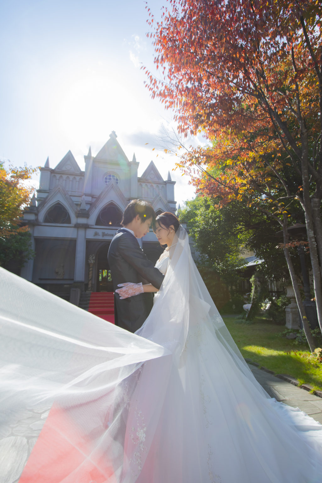 ベールは花嫁様の身を守ってくれるアイテムと言われています。そんなベールが風に舞いふたりを守ってくれているようなウェディングドレスならではの1枚です。