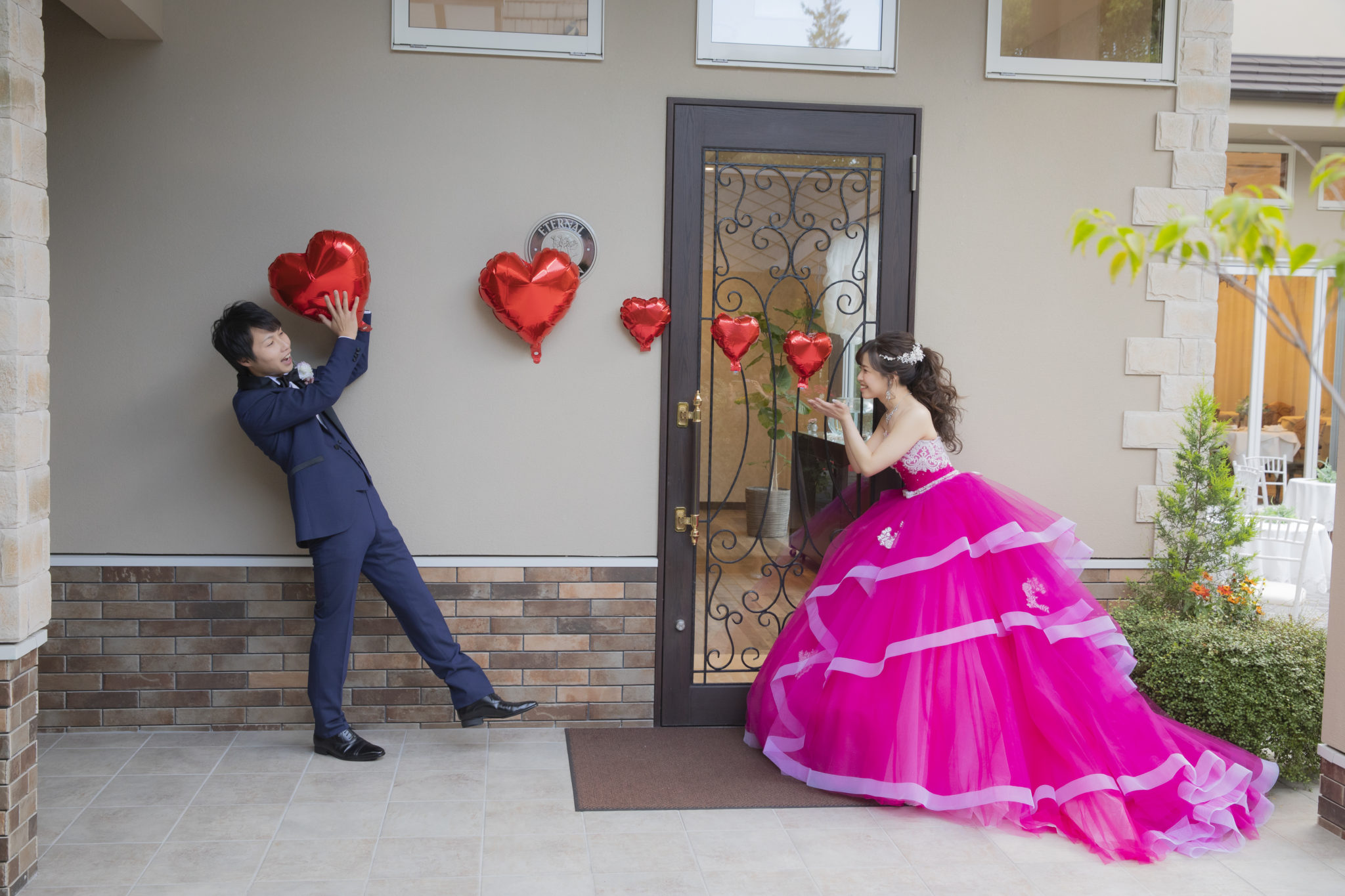 ハート型のバルーンが新婦様から新郎様へ飛んでいるようなショット。ポップでとても可愛らしいですよね。