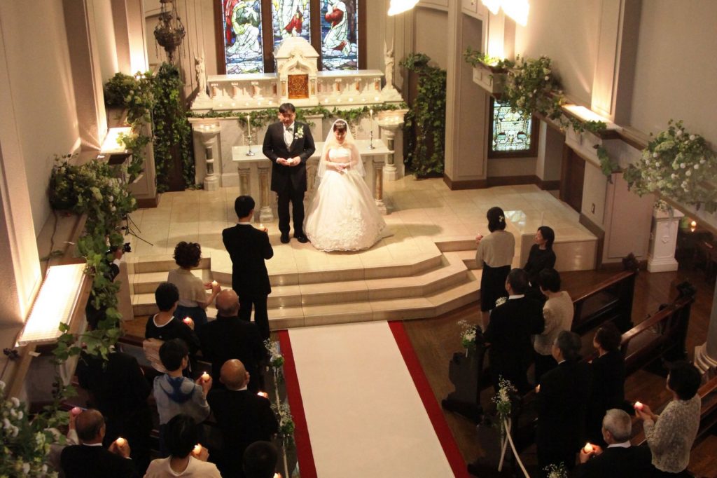 おふたりのご希望は、教会の雰囲気をそのまま感じて頂けるような人前式。聖ペトロ教会内の人前式は、意外かもしれませんが、OASIS・ENYAを始め、ドリカム・スピッツ等の邦楽もリクエスト可能なんです。「演奏が素晴らしかった」と挙式後おふたりからもお喜びの声を頂きました。