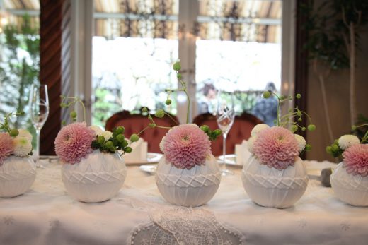 お花もとてもお好きな公香さん。ただ飾ってあるものを見るだけではなく、持ち帰られたときにも喜んで頂けるようなアレンジにしたいということで、フローリストともしっかりと打合せ。和×洋にアレンジされた会場装花はこんなに素敵♪ピンクの優しいピンポンマムの花のアレンジは、お花がお好きなゲストからも、「かわいい!」という声があがります。