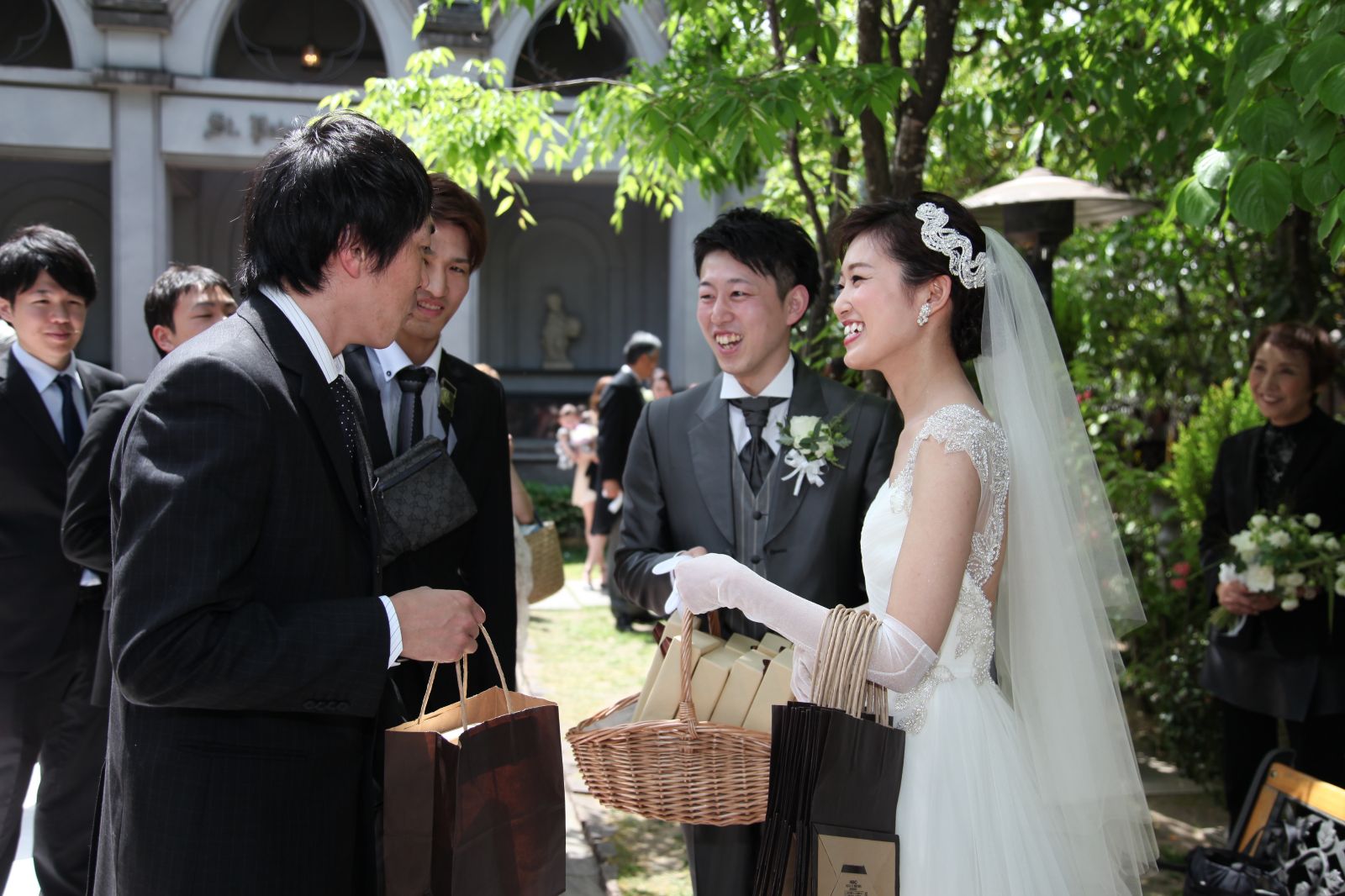 ゲストのお見送りはお一人おひとりに「ありがとう」のお気持ちを伝えることが出来るタイミング。おふたりの気持ちがこもった、素敵なプチギフトをお渡しし、最後まで笑顔でお見送り…。