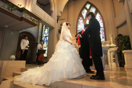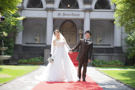 正礼装の服装である燕尾服でとってもカッコいい嘉男さんと、可愛らしい雰囲気のプリンセスラインを選ばれた利江さん。厳かな教会での挙式では、聖壇の上から流れる利江さんの長いトレーンのシルエットが、教会式では、トレーンやベールが長めのドレスを選び、横や後ろ姿を美しく見せるのもポイントです!