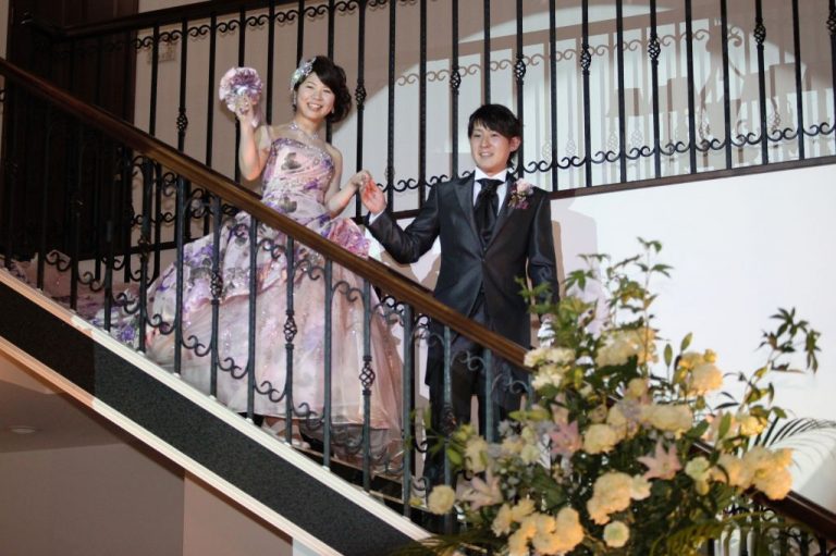 披露宴での入場は、階段からの登場です!華やかラメの入ったカラードレスに、光沢のあるタキシードは、スポットが当たる事でキラキラと反射しおふたりを一層輝かせます。