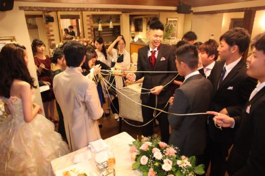 ゲストと一緒に楽しめる演出として、ご友人全員参加のギフトプルズを行いました。通常はリボンとプレゼントが繋がっている方が当たりですが、今回はハズレ無しの全員当たりでした☆リボンには記号があり、それぞれにプレゼントの内容が変わります。様々なジャンルのプレゼントがあり、とても盛り上がりました♪