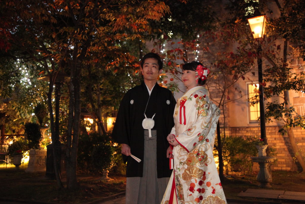 パーティーの最初は、紋付と色打掛という和装姿を選ばれたおふたり。入場前には紅葉をバックにロケーション撮影!日本の伝統美である和装姿が色付く紅葉にとても映え、季節感たっぷりの一枚に仕上がりました。