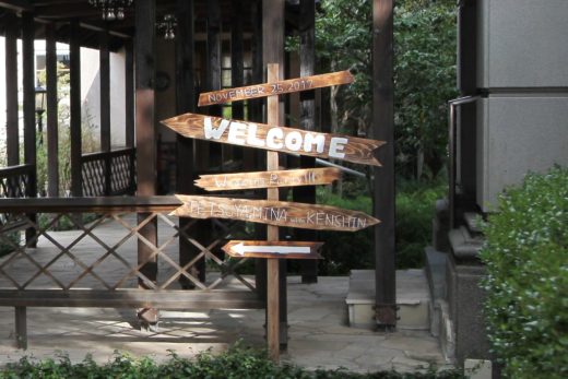 会場到着されたゲストが緑のアーチを抜けて進むと、おふたり手作りの〈 ウェルカムサイン 〉がお迎え。ゲストが迷わないようにご案内の役割もしてくれます。
