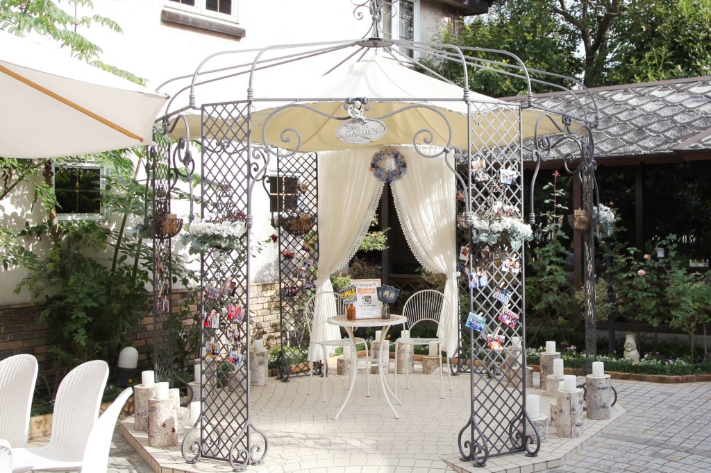 待合いスペースから望める可愛らしいガーデンのパティオでは、おふたりとゲストの懐かしい写真やフォトスペースのご用意がされていました。ゲストも待ち時間に写真を眺めたり、フォトプロップスで写真を撮ったり、楽しいひとときとなりました。