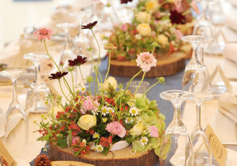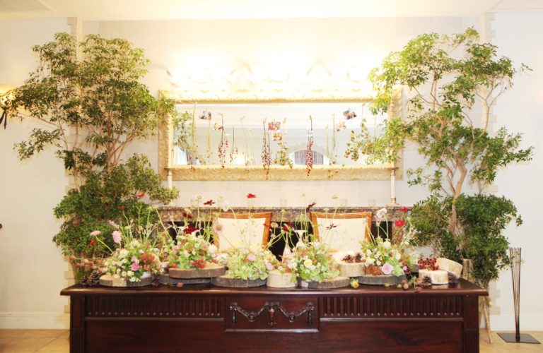 卓上装花もこだわりの仕上がりです。通常花瓶にお花が活けてあることが多くありますが、切り株を使って自然の中にいるようなテーブルになりました。
