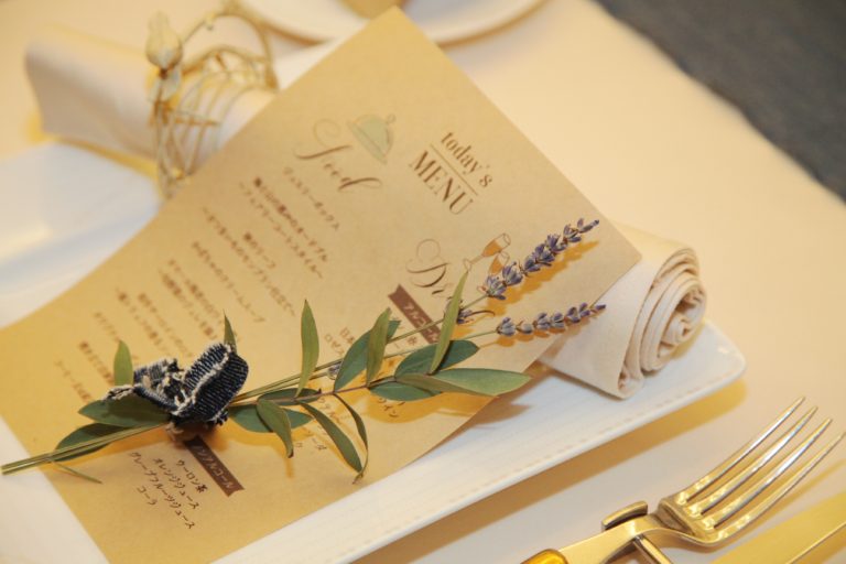ペーパーアイテムも真っ白ではなく、切り株になじむブラウン系のカラーで統一しました。メニュー表に添えられたお花も可愛らしくて素敵です。こっそり美菜さんのお好きなデニムでお花を結んでいるのもポイントです。