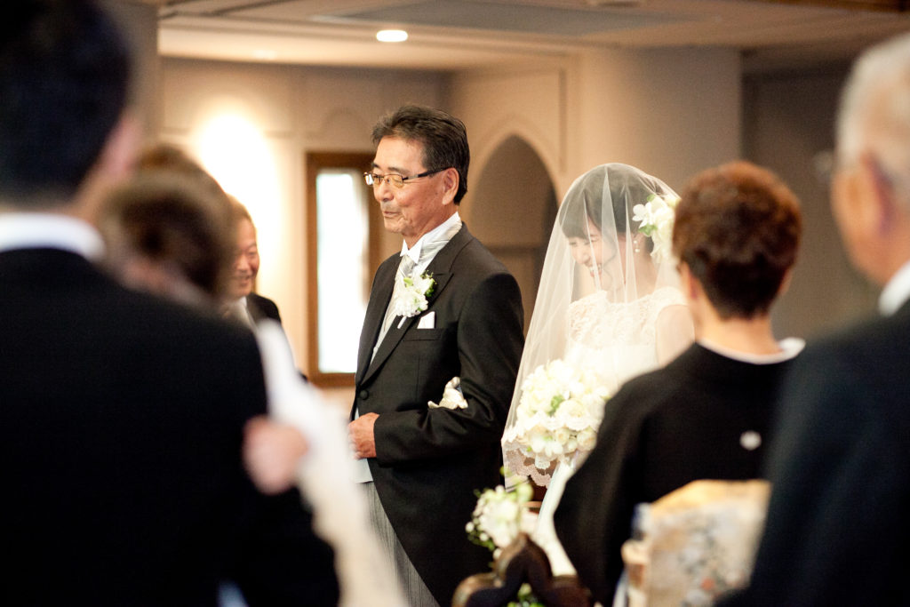 チャペルの扉から入場し花嫁の人生が始まります。最初の一歩は「誕生」を意味しています。大切な家族と歩くその「一歩 = 一年」と考えて、過去の一年一年を振り返りながら歩いていきます。礼拝席からは、その姿を今までに出会ったたくさんのゲストが、見守ってくれています。そして、バージンロードの先には大好きな新郎の姿が…。今までは大切な家族と共に、新郎と出会う為の道を歩み、そして新郎と出会い、大切な家族から新郎へとバトンタッチ。その先の道はふたりの「未来」を表しているのです。