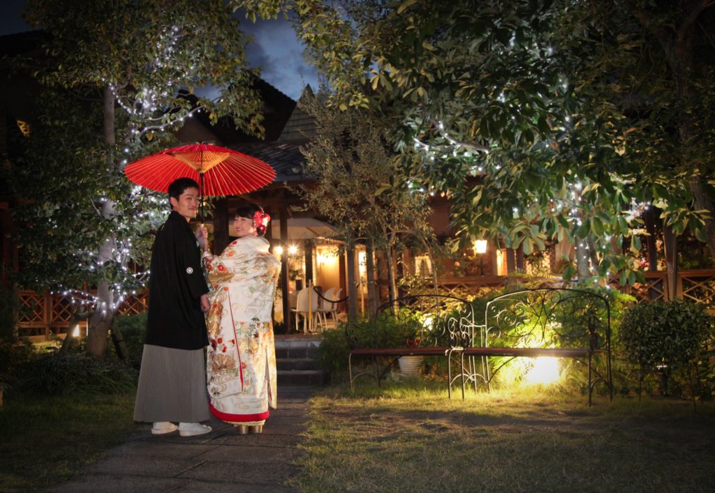 実は、和装での撮影でも夜景はとても素敵!ライトの明かりがまるで灯篭のようにおふたりを照らしてくれて、温かい雰囲気を作り出せます。