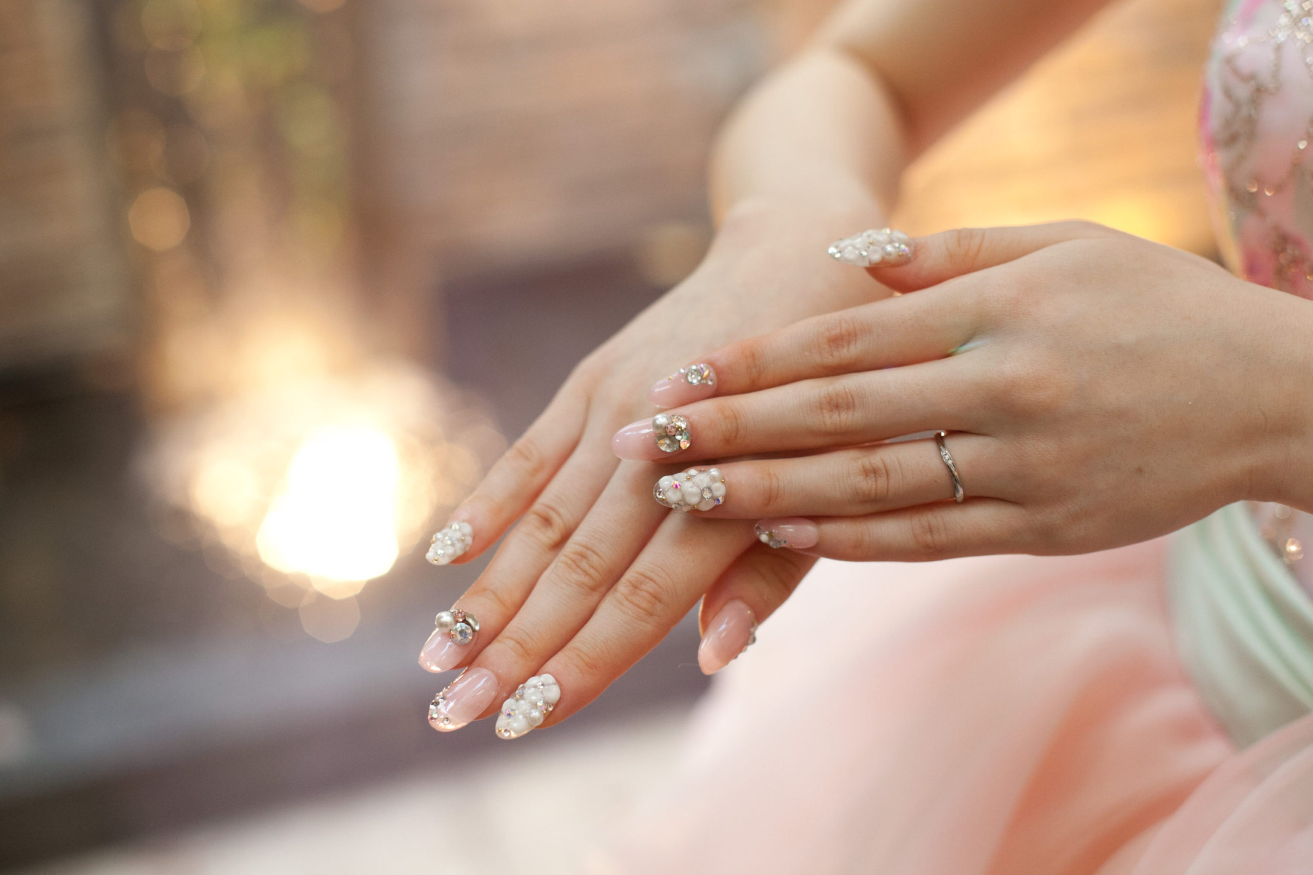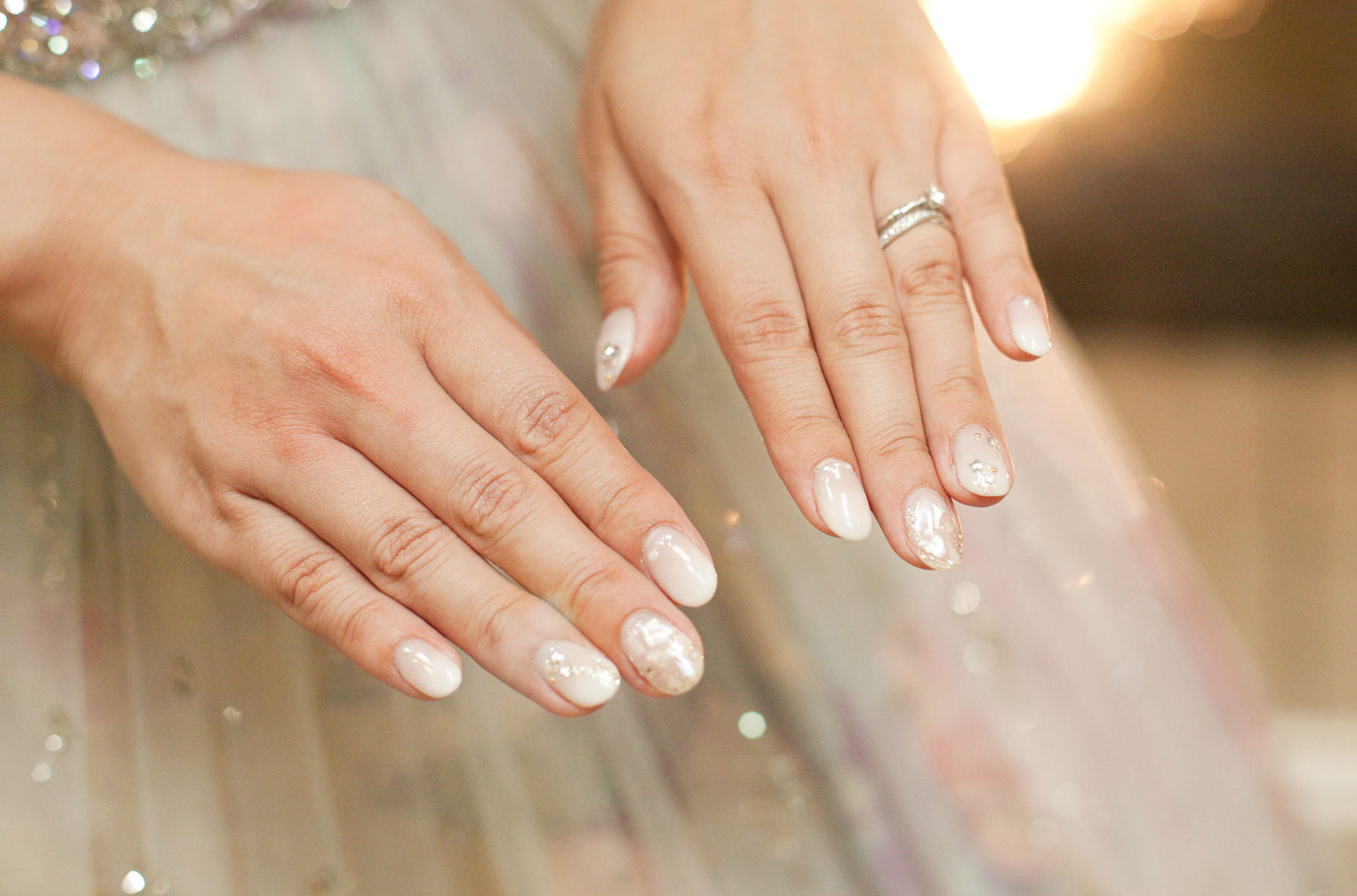 ブライダルネイルとふつうのネイルに大きな違いはありません。しいて言えば、ブライダルネイルとは〈結婚式やドレスに合ったネイル〉です。例えばウエディングドレスの白に合ったネイルであったり、パーティのテーマカラーに合わせたり、結婚式とネイルがマッチした仕上がりになります。とはいっても基本的な施術方法は同じなので、まずはそちらをご紹介します。