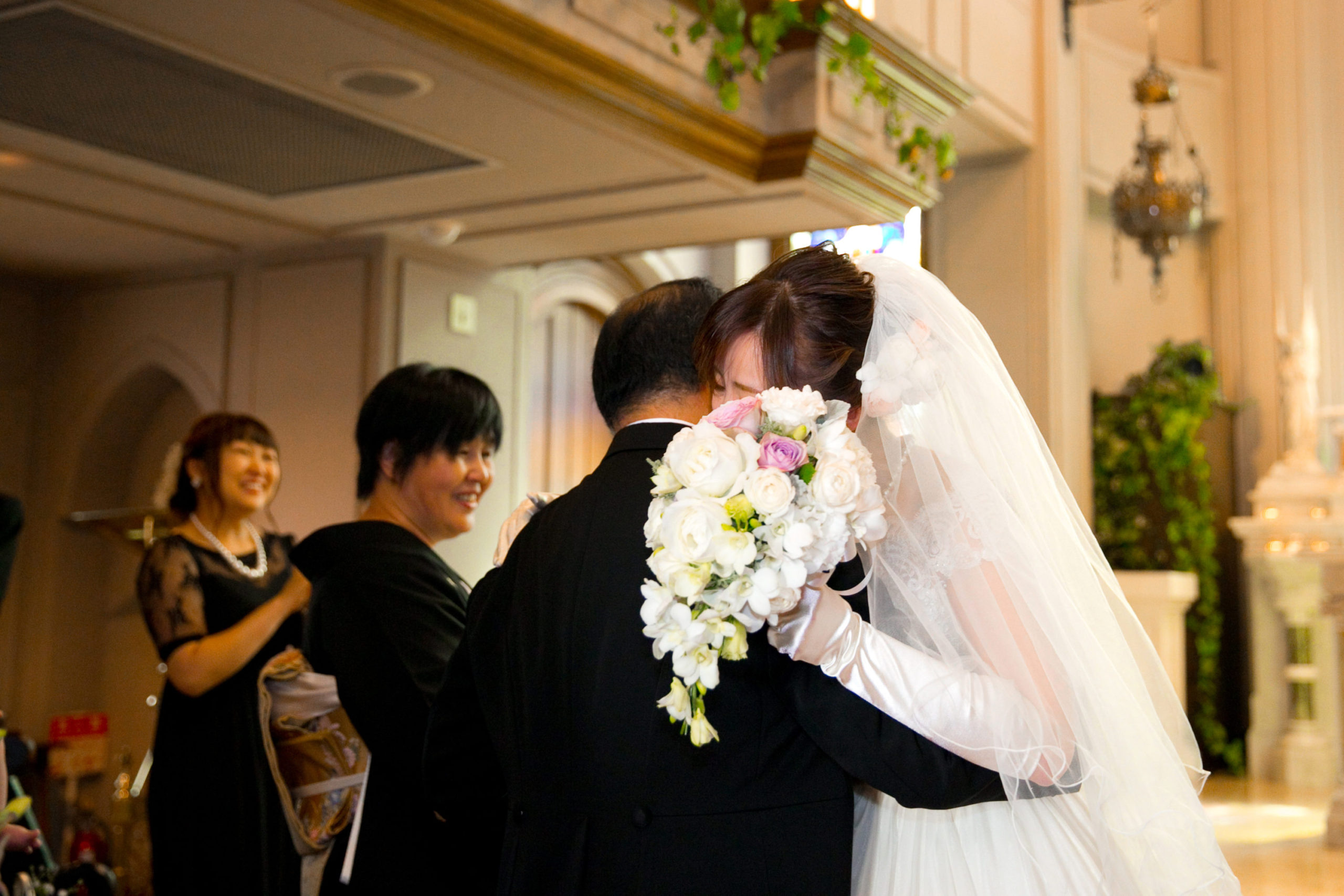 これまで一番近くで見守ってくれたご両親に「喜びや感謝を伝えたい!」というお気持ちから、まずはそれぞれご両親のもとに。握手をしたり、言葉を交わしたり、ひと時の親子の時間を過ごすことで、挙式の感動を分かち合っていました。そして最後には…思いが込み上げてのハグも。