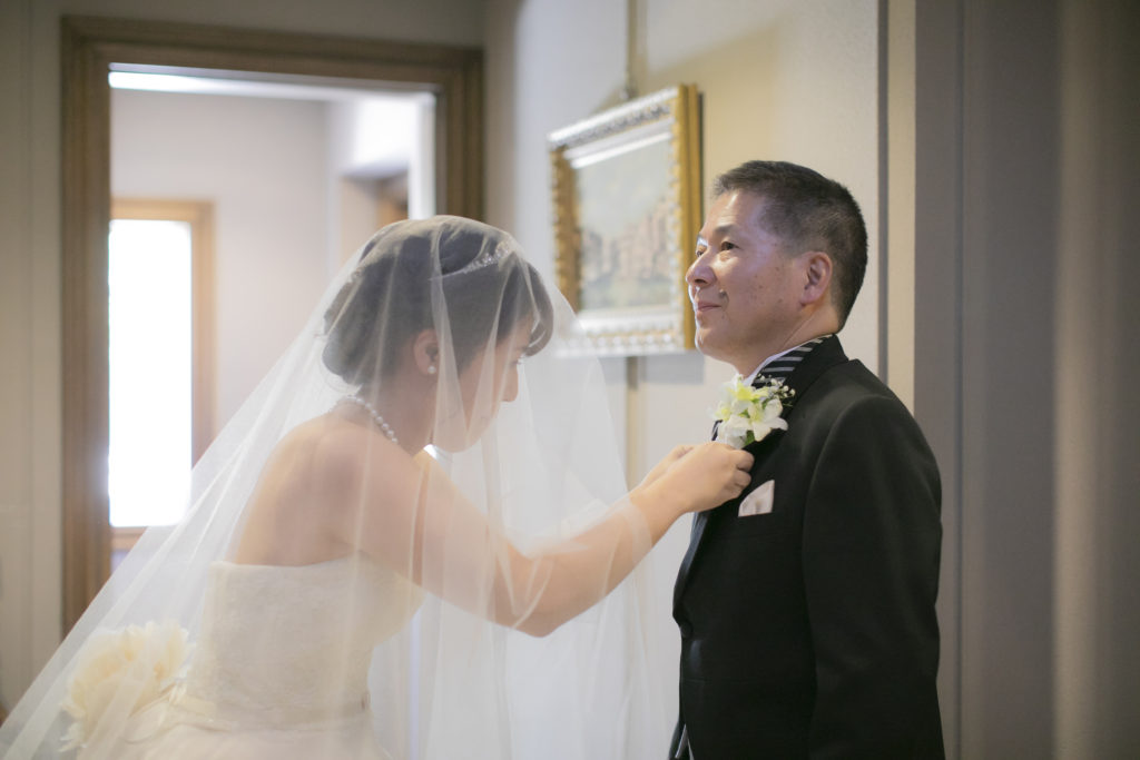 ご入場前のひととき。「今までありがとう」の一言と一緒に、胸元にコサージのお渡しです。