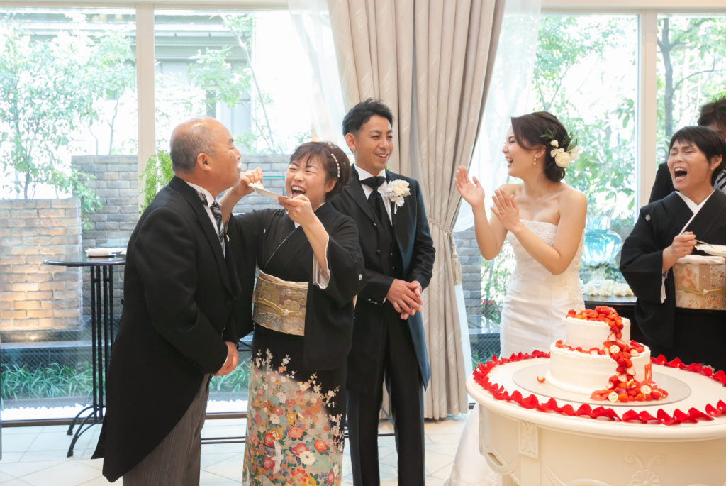 お母様演出の際には、【 サンクスバイト 】【 ラストバイト 】をご紹介いたしました。この【 お手本バイト 】はお父様お母様揃っての演出です。文字通り新郎新婦さまのファーストバイトの前に、お手本としてご両親に行ってもらいます。照れくさそうにされながらも、笑顔のご両親のお姿に自然と会場もなごやかな雰囲気になります。