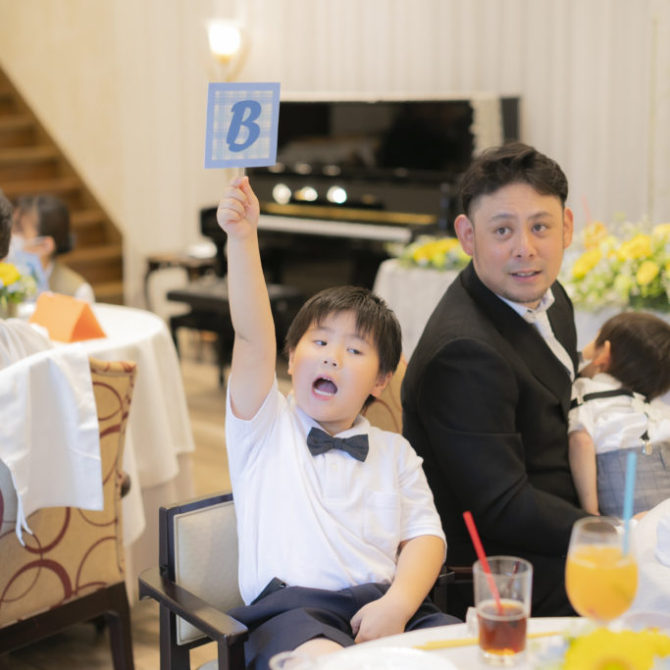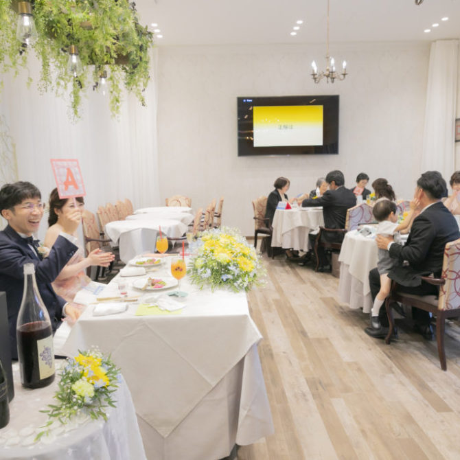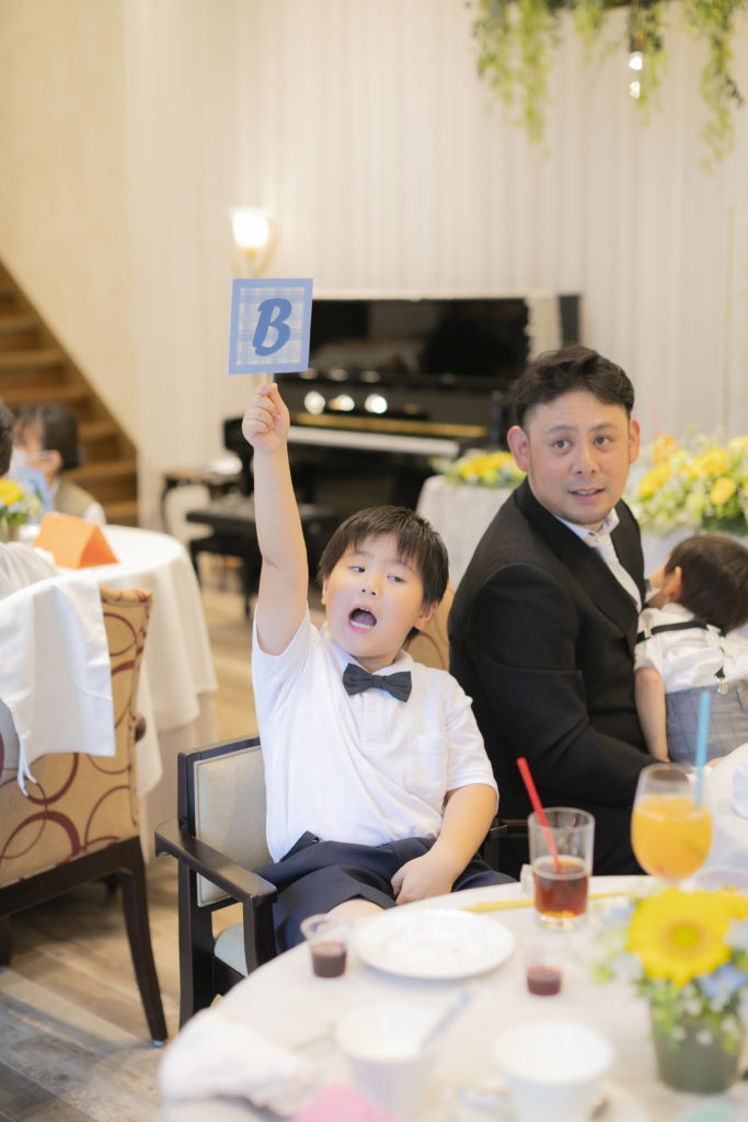 続いて、「知識運アップ」。うさぎ型クッキー付きのデザートかけ、テーブル対抗で格付けチェックを行いました。某TV番組さながらの再現で、おふたりからのドキドキの正解発表では、お子さまから大人の方まで楽しんでいらっしゃいました♪おふたりからのデザートサーブで、皆様にも幸せのおすそ分け!「いつもありがとう」そんな感謝の気持ちを込めて…。
