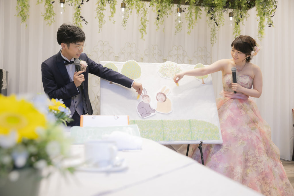 そして、保育士の壮司さんならではのお時間。おふたりによる「しろいうさぎ と くろいうさぎ」の朗読です。この日のためにと手作りのパネルシアターを準備され、おふたりやご家族の思い出を入れたオリジナルストーリーに!思い出を懐かしむとともに、絵本を通して、”家族の大切さ” ”おふたりの温かさ” が伝わるひと時となりました。