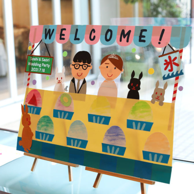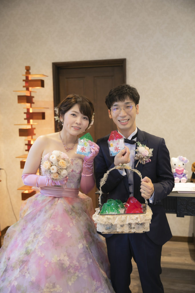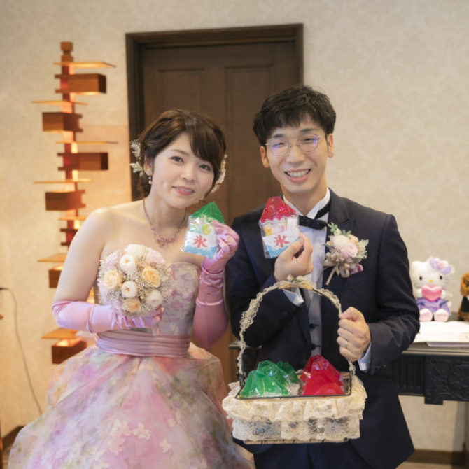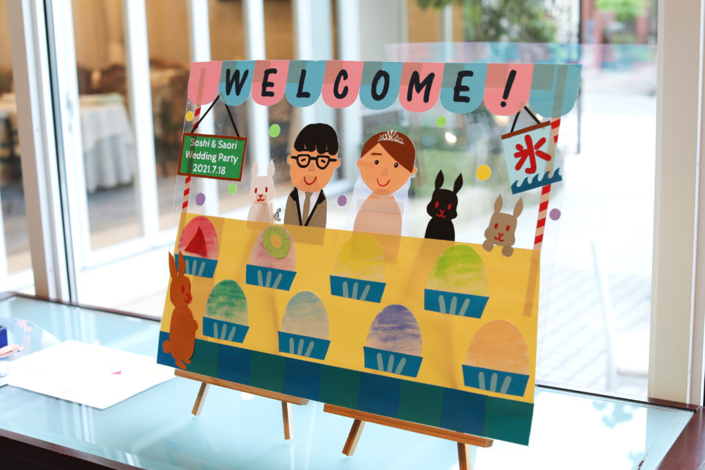 1日のスタートは、夏の風物詩であるかき氷をイメージしたボードの飾り付けから!おふたり手作りのフルーツ型のメッセージカードで、見事ご両家の皆様による特製かき氷が完成しました!プチギフトもかき氷風のものにこだわり、皆様に感謝の気持ちと涼やかさをプレゼントしました。