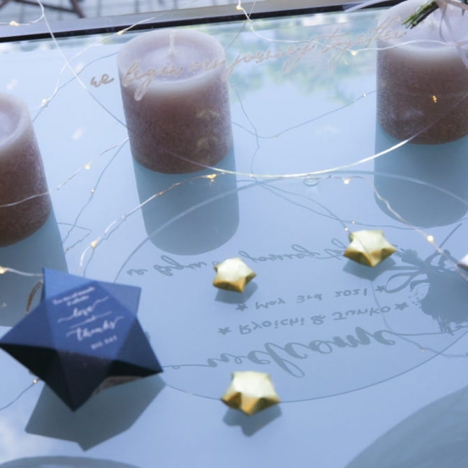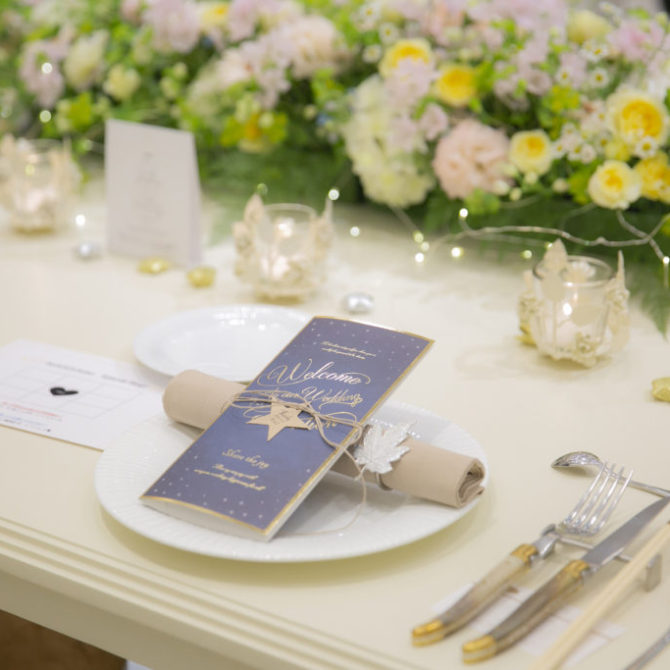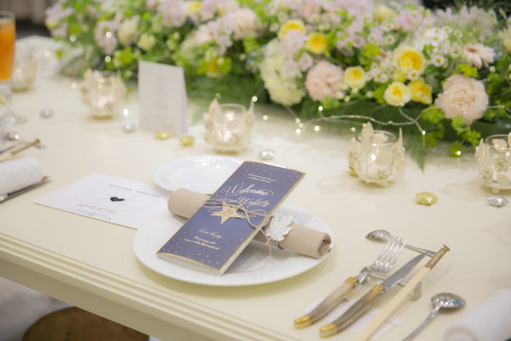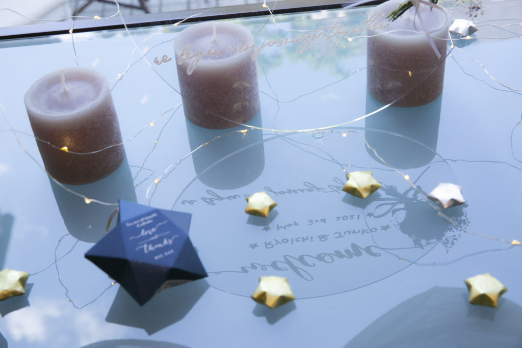 奇跡のような偶然を多く経験されていること、涼一さんが造船のお仕事をされていること等にちなみ、おふたりの結婚式のテーマは “ 途しるべ ‐ みちしるべ ‐ ”