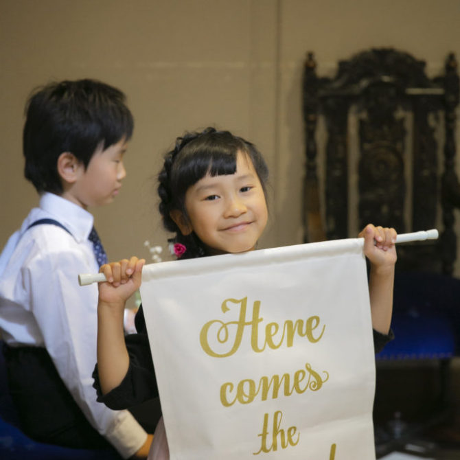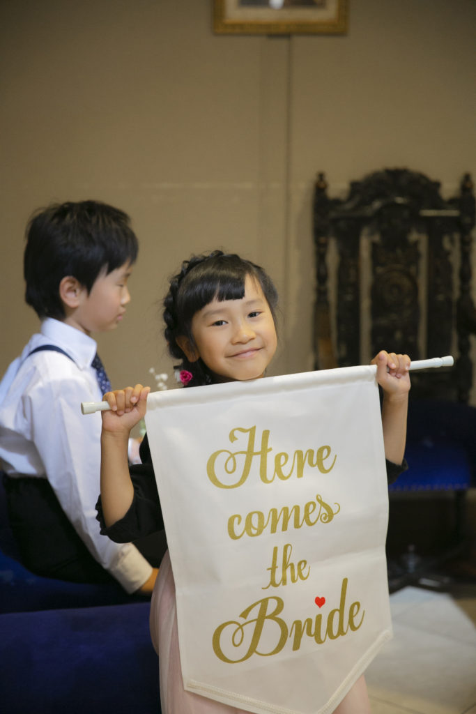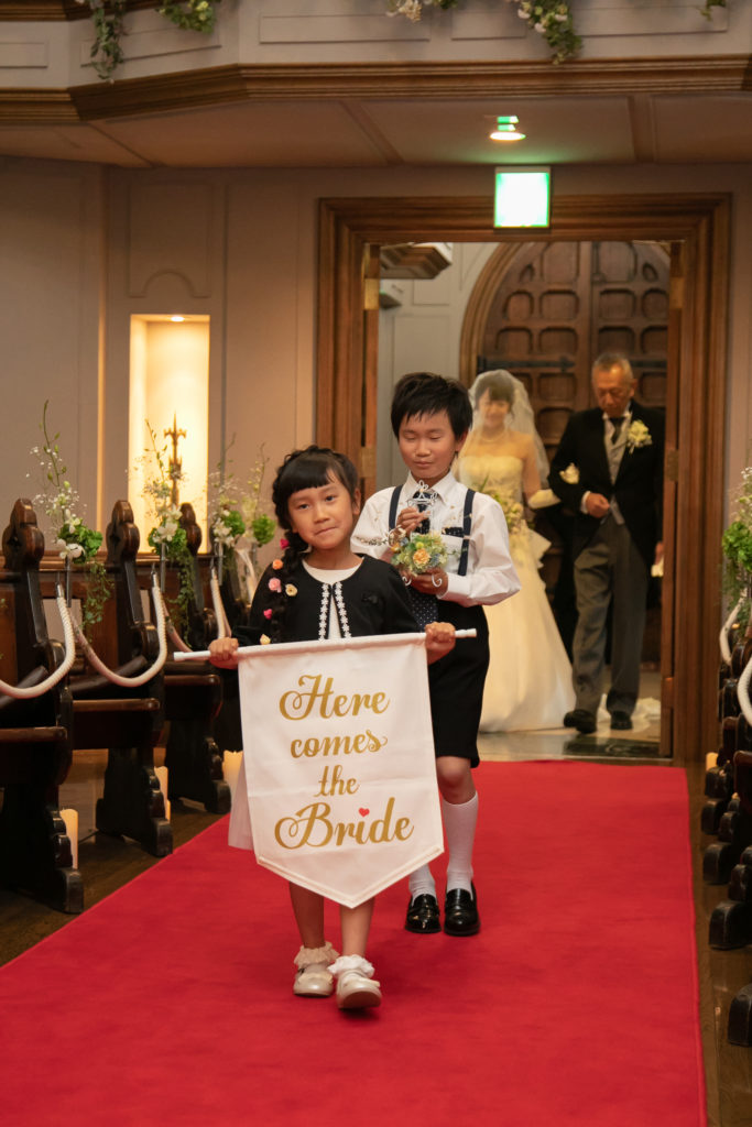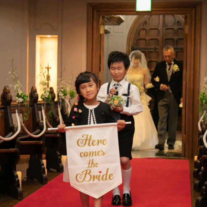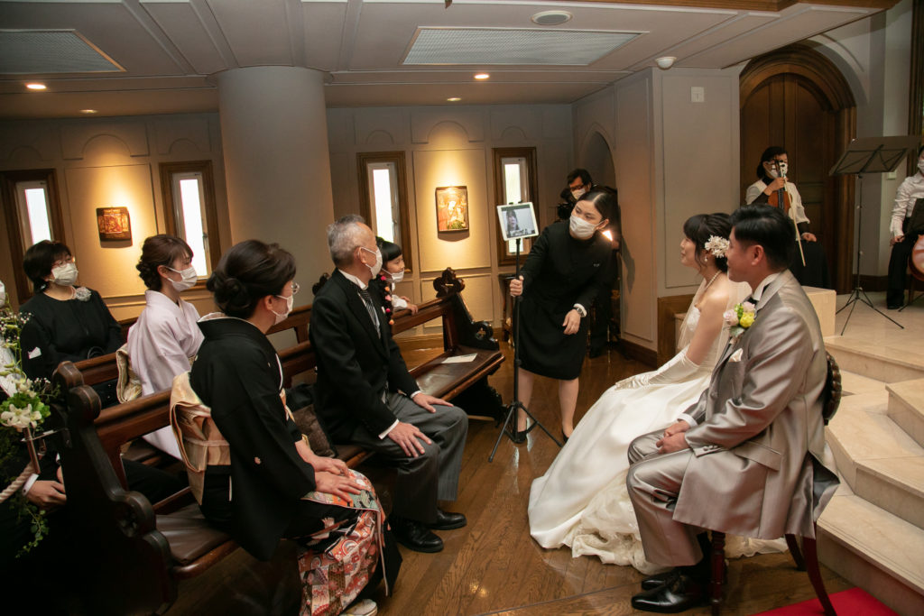 挙式前には、遠方のご家族とzoomを繋ぎ、リモートでの親族紹介を行いました。挙式中には姪っ子さんに、船に風向きを教える“フラッグ“を持っておふたりを先導していただきました。