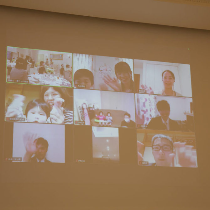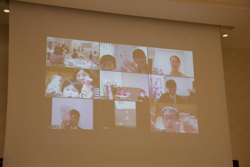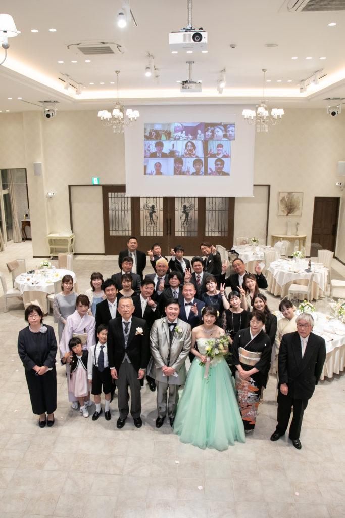 パーティーではリモートの皆様にも楽しんでいただけるようにと乾杯やおふたりのエピソードビンゴは、一緒に参加していただき、ビンゴになった方の景品はご自宅へお送りしました。会場内もリモートの皆様も、一体となってとても盛り上がっていました。