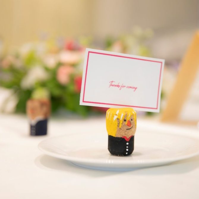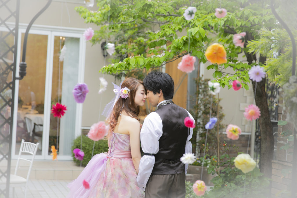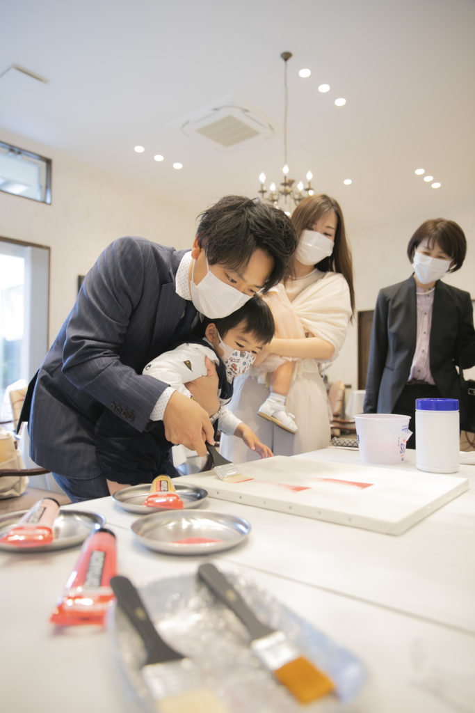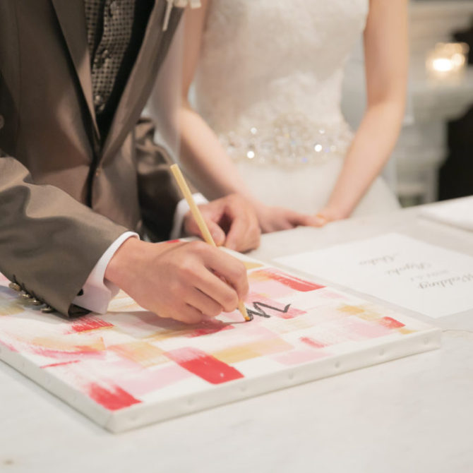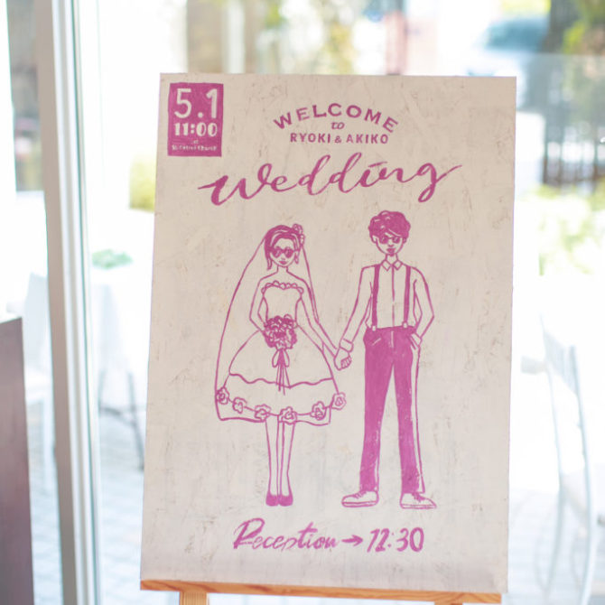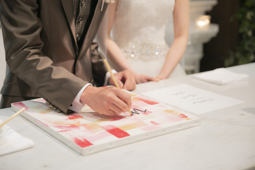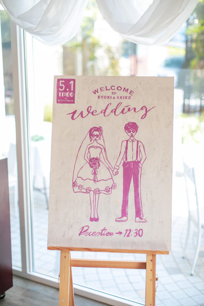 待合スペースには、凌希さんが描いたウェルカムボードや、亜紀子さんが手掛けたフラワーカーテンでフォトブースをつくったり、絵本の読み聞かせ風のDVDの上映。そして、ゲストの皆様と創る人前式用の承認キャンバスボード “ブラシストローク” では、皆様に一線ずつ描いて頂き、挙式中にふたりが筆でサインされ、完成しました。また、席札のスタンドは、ゲストの方の似顔絵コルクも手作りされるほどこだわり、おふたりのゲストの皆さまを楽しませたい!思う気持ちがしっかり伝わってきました。