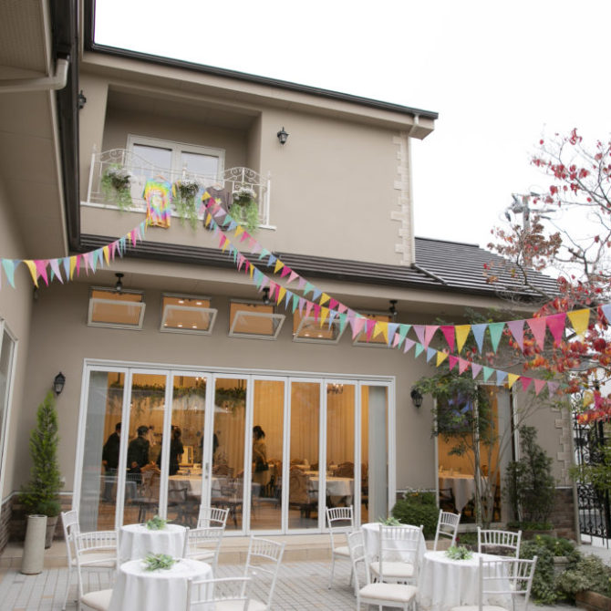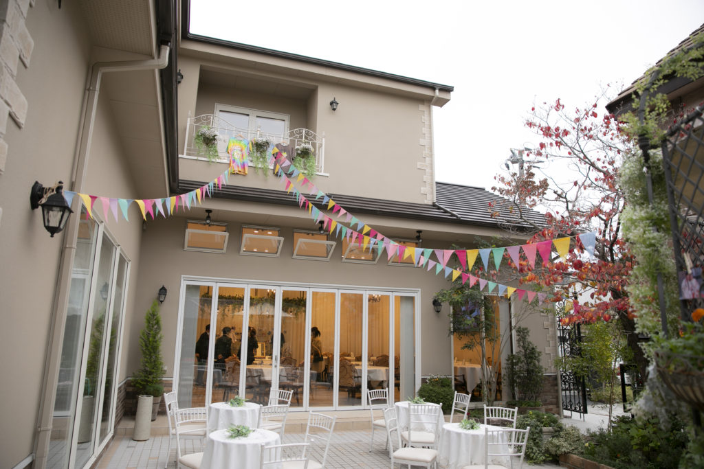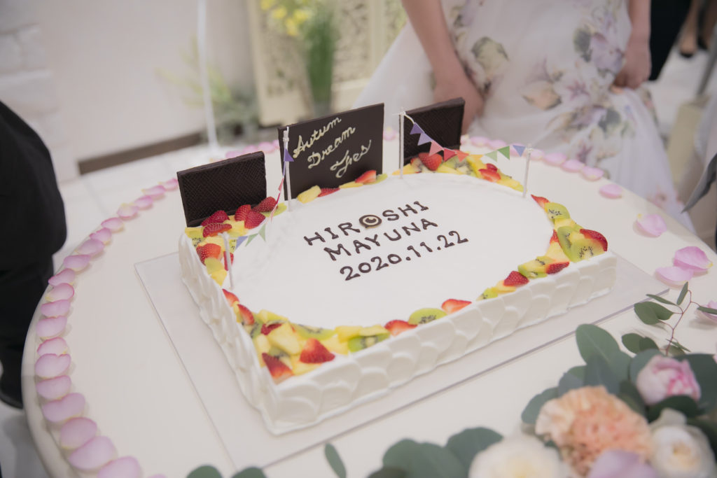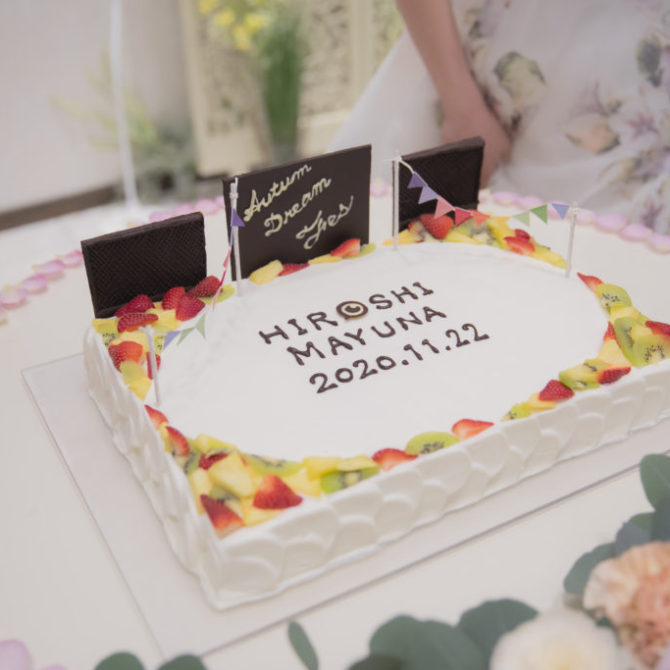 コロナ禍で、直前まで結婚式を延期にするか行うかをギリギリまで迷っていましたが、ガーランドやTシャツ・タオル・ペンライトなどの装飾、音楽フェスをイメージしたウエディングケーキ、BGMやダンスなど全てにこだわって準備を進められました。オンラインでのご友人とのやりとりも楽しかったですね。