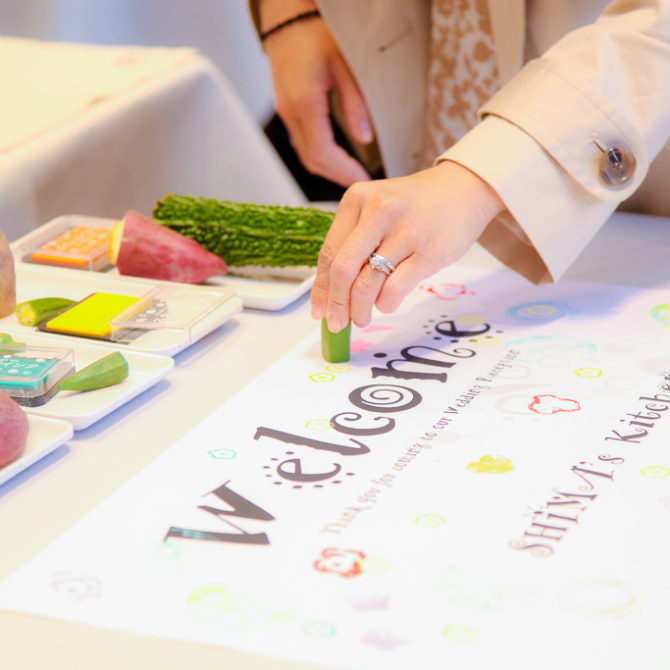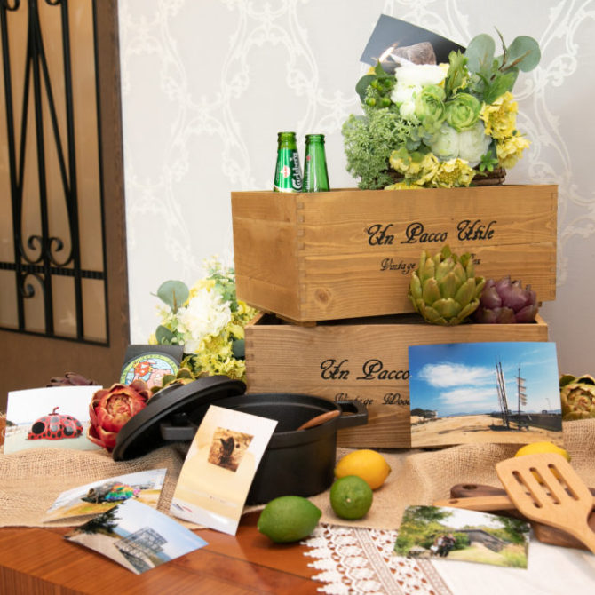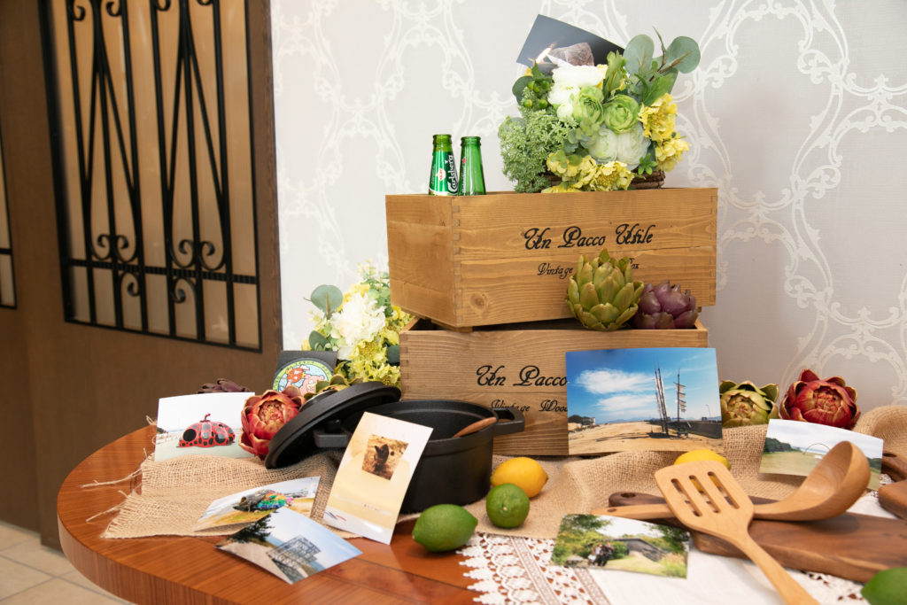招待状デザインを芸術祭で実際に使用されたパスポート風にアレンジするなど、ご招待の段階から当日に至るまで、沢山のこだわりをちりばめました。会場には、おふたりが瀬戸内の島で撮影した沢山の写真を始め、キッチングッズや野菜を飾り付けてお出迎え。またゲスト自ら「野菜で出来たスタンプ」を使って、世界に一つだけの「ウェルカムボード」と「エプロン」を作成してもらいました。エプロンを身に着けて行ったご入場やファーストバイトは、写真に残っても楽しい思い出の瞬間に。
