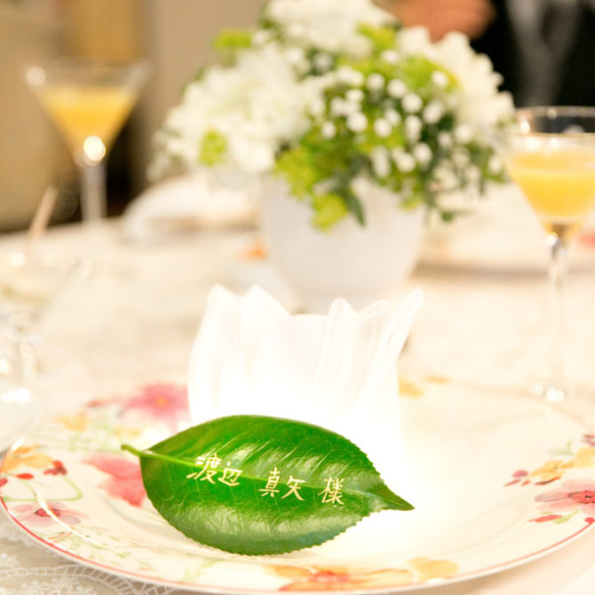 テーマは小さな庭。ポイントはリラックス感です。新緑の時期を迎えたお庭と、会場は緑と白に統一しました。席札も椿の葉っぱに名前を書きました。