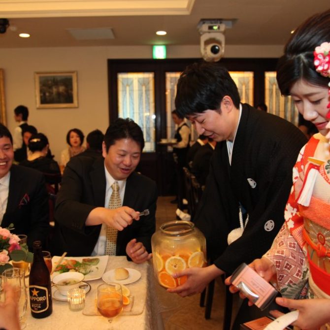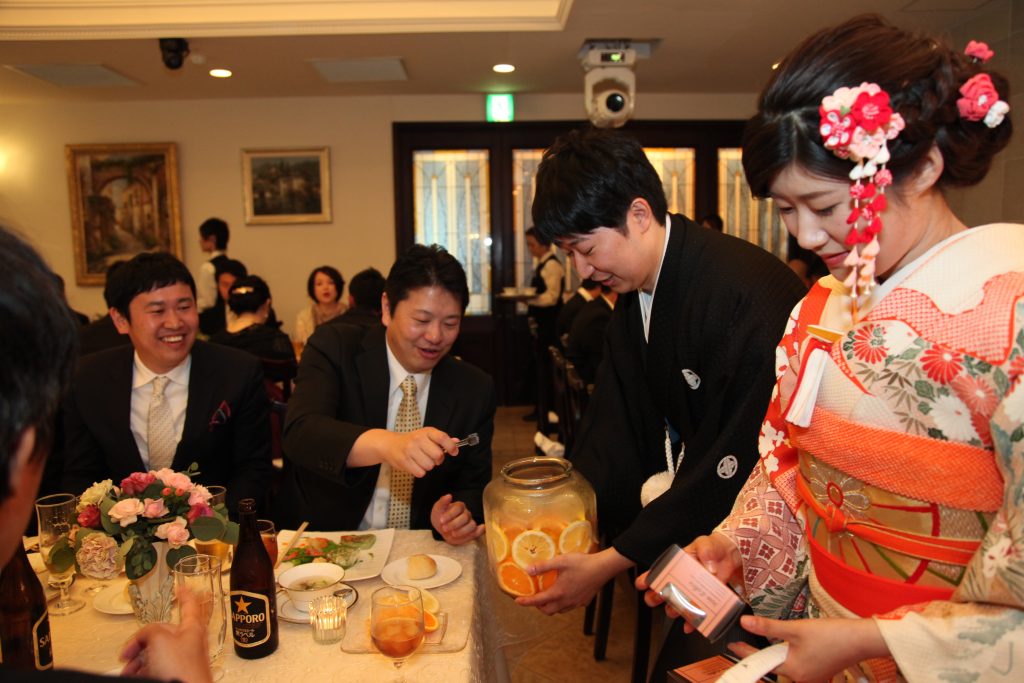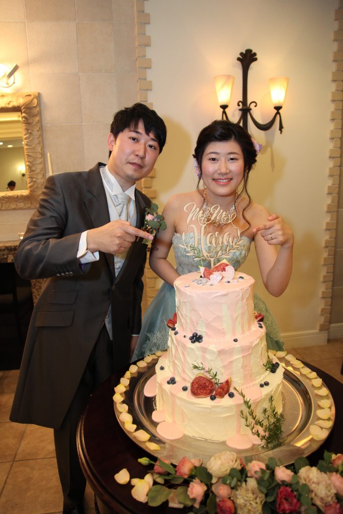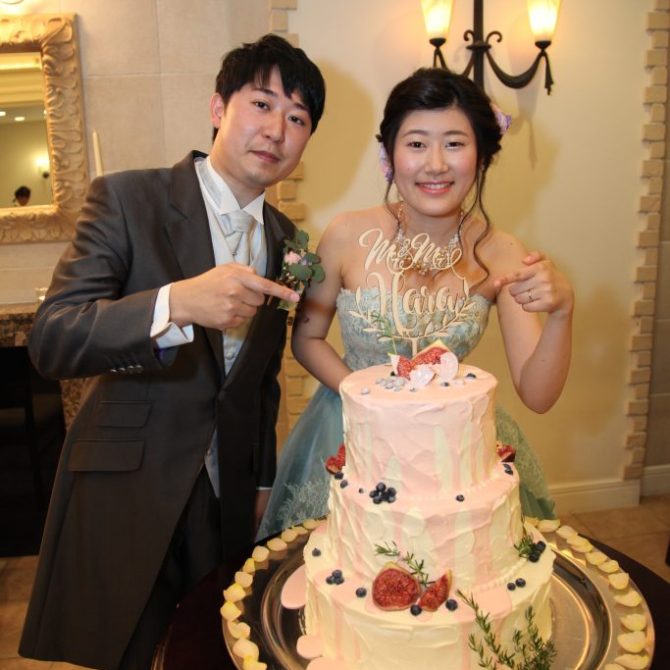 果実酒作りでは私たちが広島と愛媛出身なので、カットした広島レモン・愛媛の清美タンゴールとニューサマーオレンジを各テーブルにおいて、代表の方に瓶に入れて頂きました。またウエディングケーキ入刀の代わりにカラードリップをしたり、ふたりの名前が入ったオーダーメイドケーキトッパーなどの演出でも全て私たちの想像以上の演出になり、素敵な結婚式となりました。