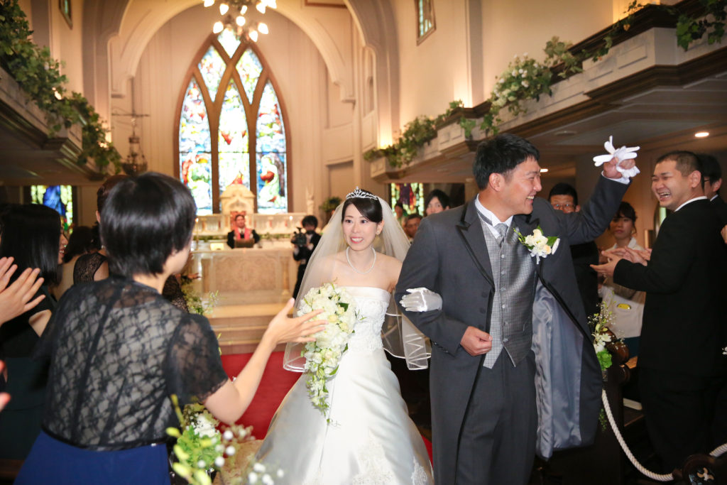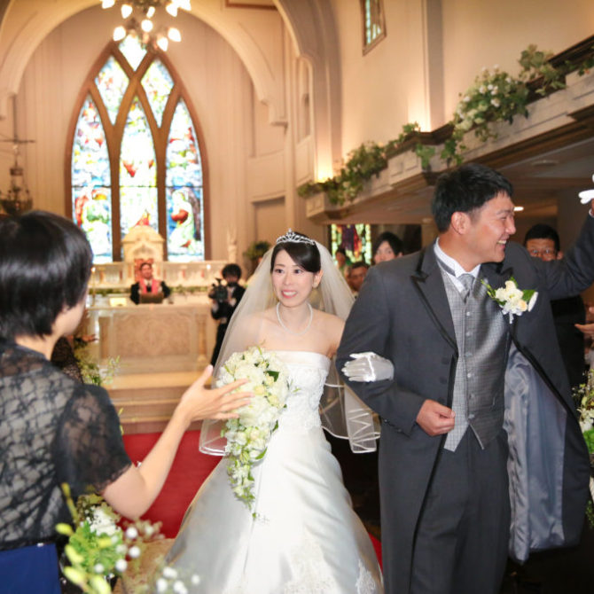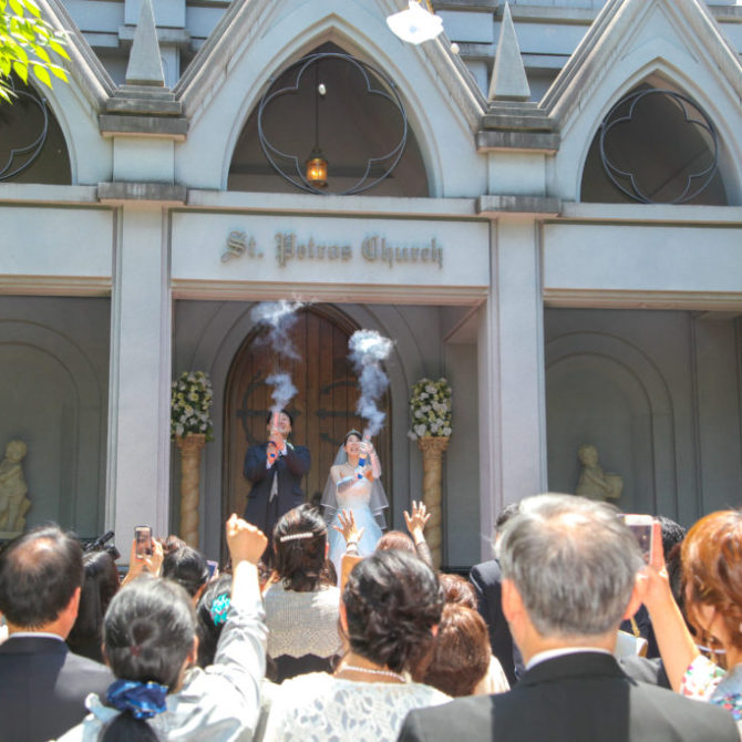 聖堂を見て雰囲気が気に入ったことと、特にステンドグラスがとても印象に残り聖ペトロ教会を選びました。模擬挙式での新郎の入場の仕方が印象的だったので理由を伺ったら、バージンロードの意味も丁寧に教えていただいて、「他の式場とは違う式が出来そうだな」と思いました。