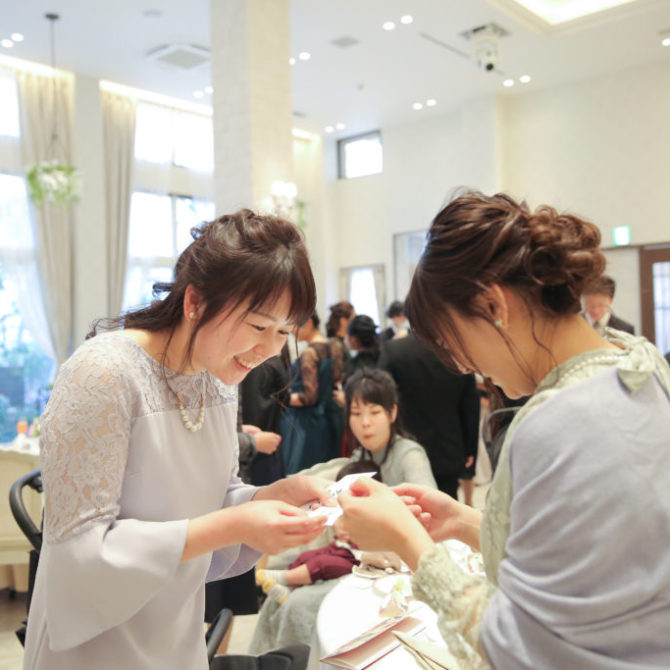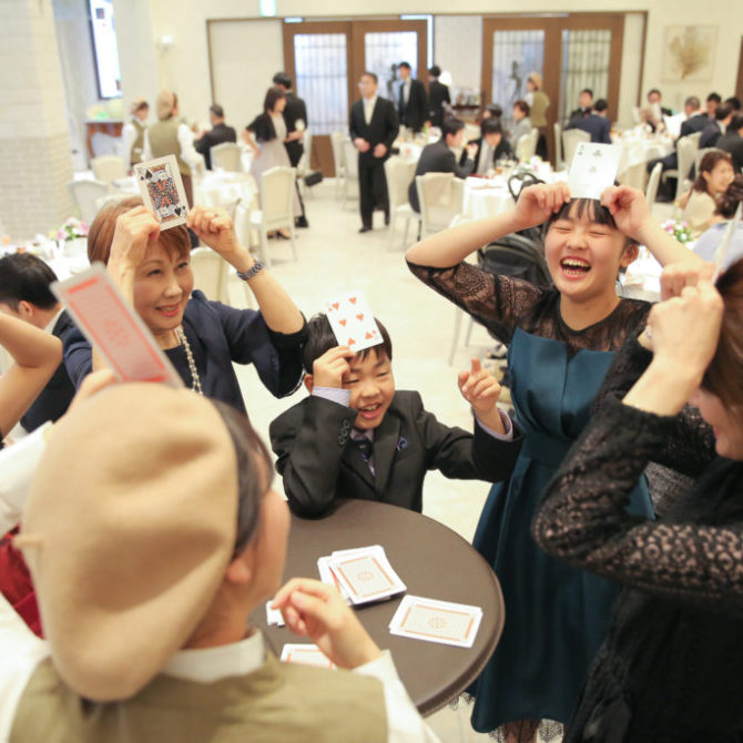 パーティでゲスト同士が仲良くなるきっかけとなるよう行った《名刺交換》。小さなお子様からご年配ゲストまで、交流が深まりスタッフがビックリする程の盛り上がり!