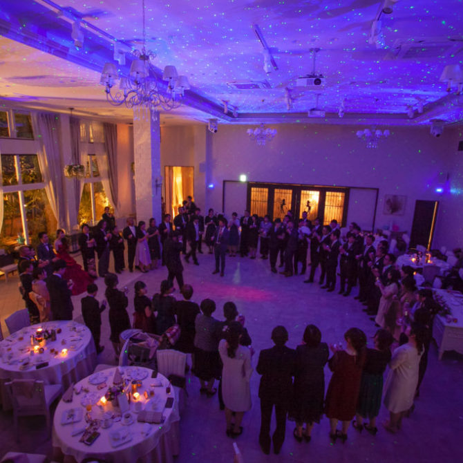 全員参加型の乾杯でパーティスタート!招待状で募集したゲストからのリクエスト曲が流れ、会場が盛り上がる中、会話や写真撮影などふれあいの時間を大切に過ごされました。