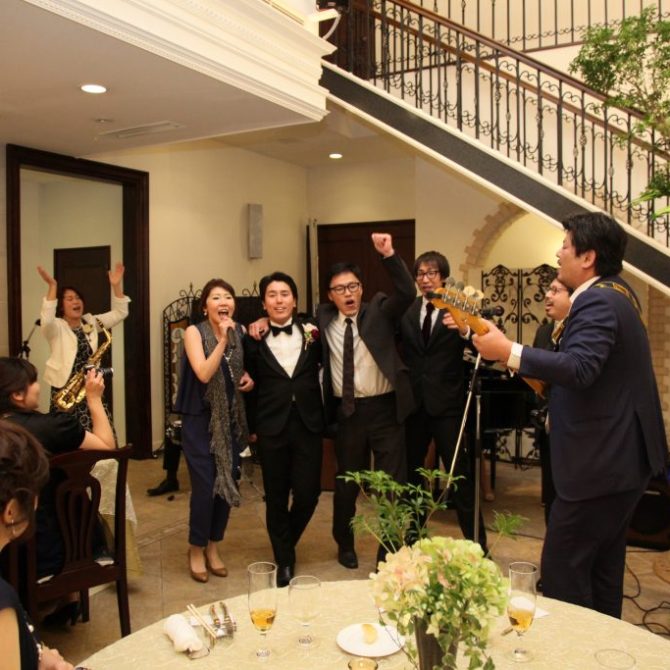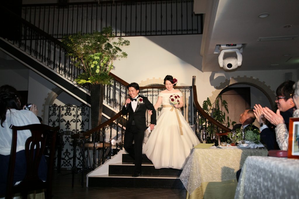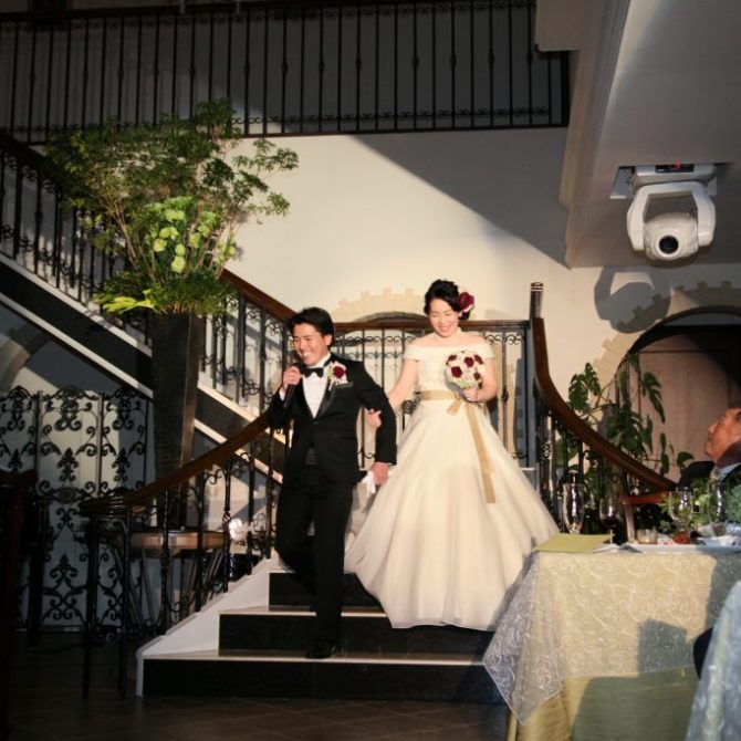 パーティではお色直しで和装からドレスへ。主人が歌いながら先に入場し、私を迎えに来てくれる…憧れ続けた大階段の入場は心から感動・感激しましたし、ゲストの皆さんにも楽しんでもらえました。入場シーンも何度かリハーサルをさせて頂け、それも素敵な想い出になりました!バンド演奏のための音響関係の準備等も快く引き受けてくれ、丁寧な対応に感謝しています。
