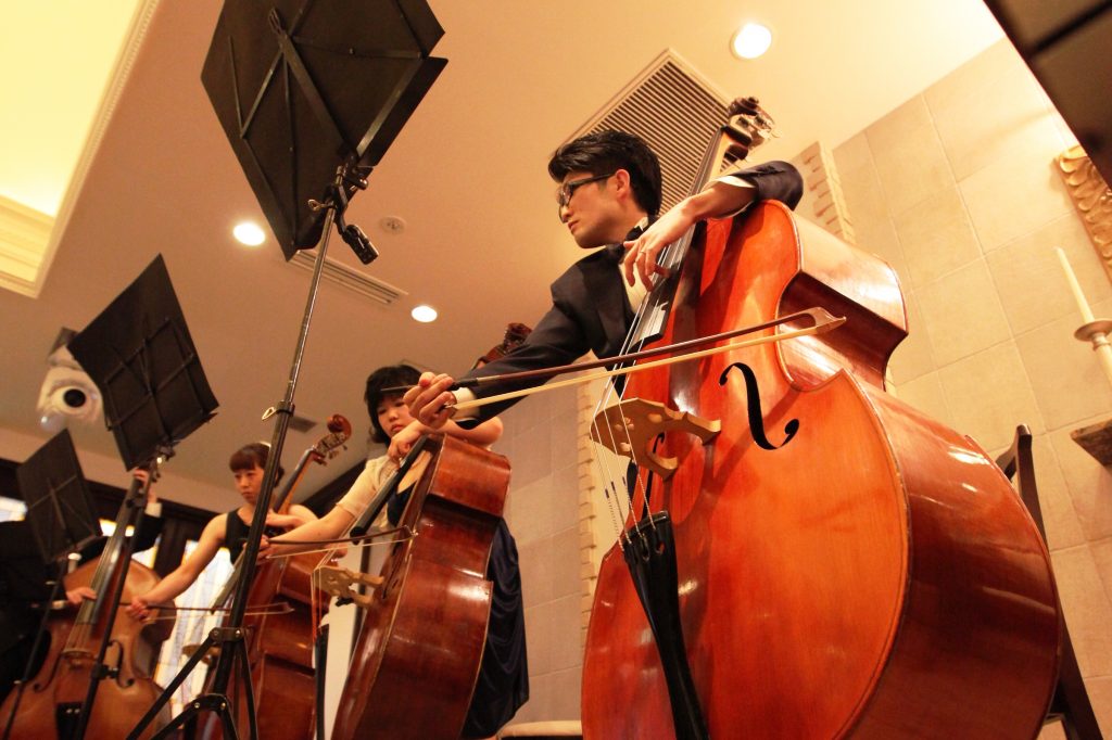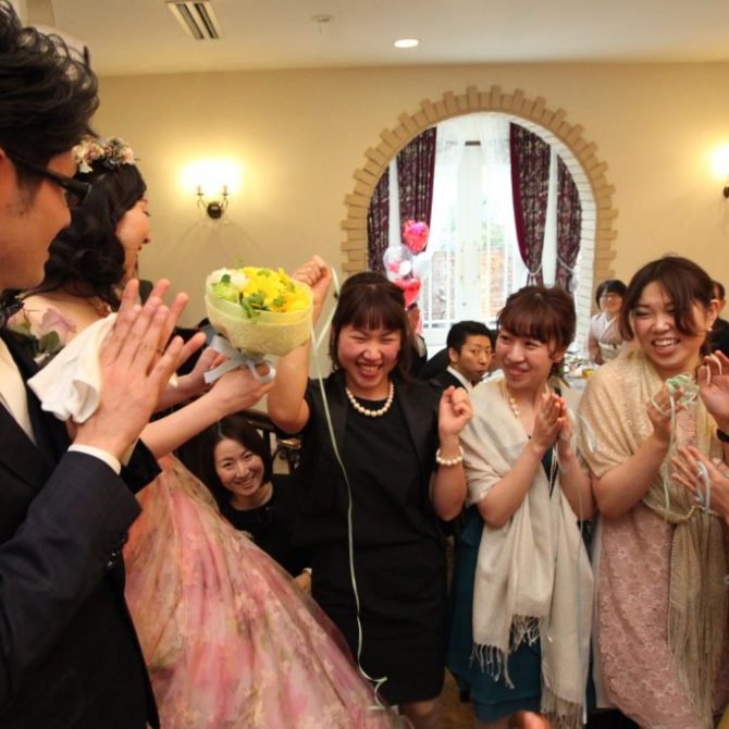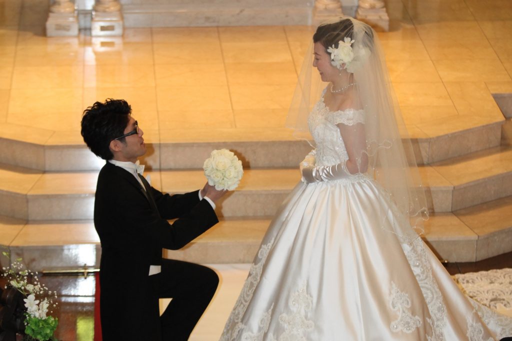 当日、挙式は聖堂でゲスト一人ひとりから花を受け取りまとめたブーケでのプロポーズ。そんな演出から始まるオリジナル人前式。列席者の温かい祝福の中、ふたりらしい誓いができました。パーティは主人の仕事柄、音楽にこだわりたいという希望がありました。BGMや余興も生演奏にしたりと、たくさんの希望を聞いていただきました。プランナーさんが音響関連のこと等、丁寧に準備をしてくれ理想のパーティが実現できました!
