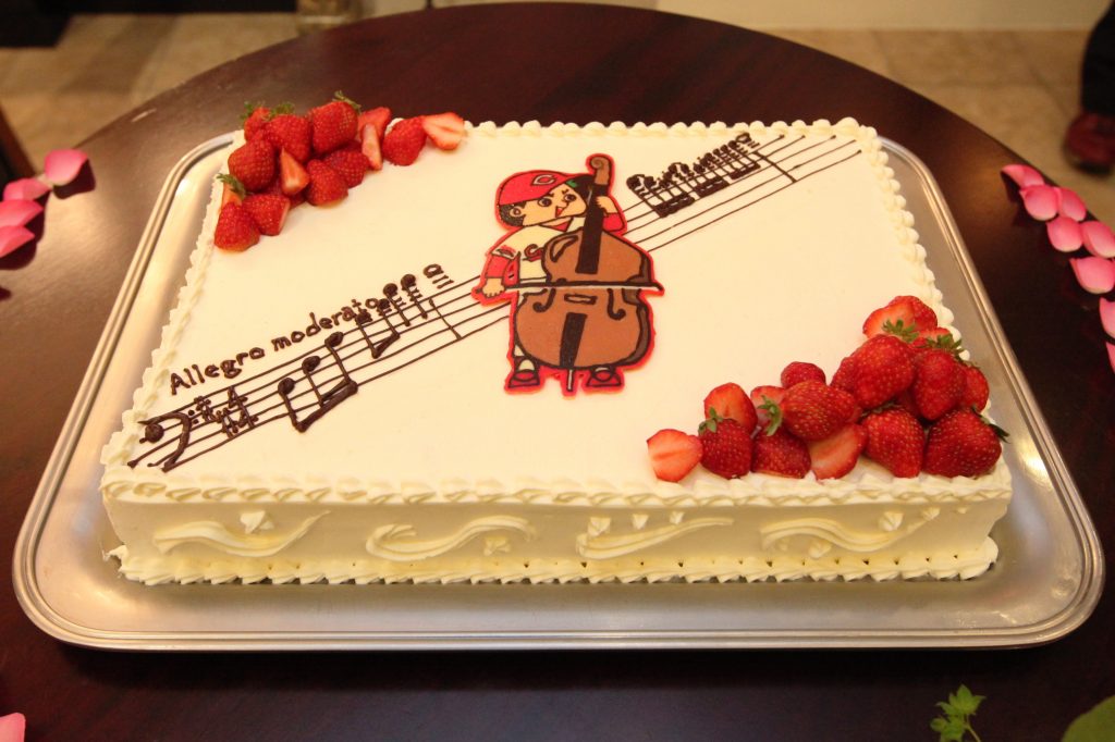 特にこだわったのがウエディングケーキ。私の好きなカープ坊やが主人の楽器であるコントラバスを演奏するデザインをお願いしました。次の打合わせの際には、プランナーさんがふたりのアイディアを見事に活かしたデザインを作ってくれていました‼感動‼