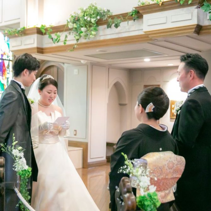 聖堂やパーティ会場のアットホームな雰囲気や、ご家族や友人とのふれあいを大切にする、ペトロ教会ならではの1日の過ごし方をとても気に入ってくださったおふたり。悠さんは今まで、何か人生の節目のとき、必ずご両親に感謝のお手紙を書いてきたそう。いつもは恥ずかしくて読めないけれど、結婚式という特別な日は、晴れ姿のお披露目とともに、溢れる思いを伝えられました。