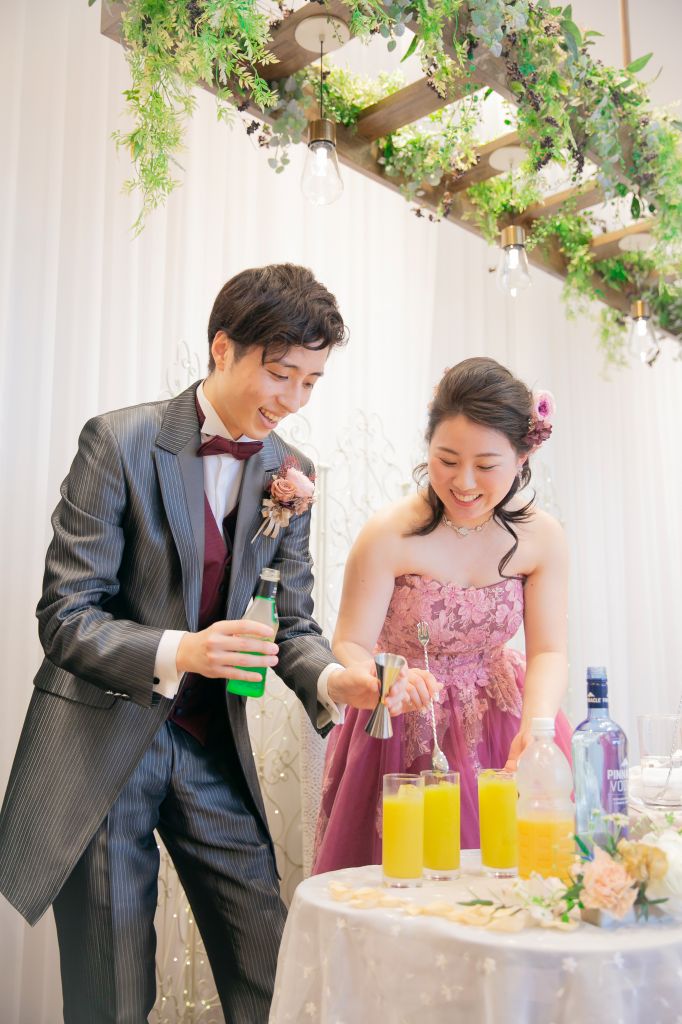 お酒や食べることが好きなおふたりは、料理でもしっかりおもてなし。出身地の食材を使用したり、バーでよく飲んでいたカクテル「メロンボール」をふたりが一緒にパフォーマンス!他にも、おふたりおすすめの焼酎や赤ワインを持込み、オリジナルドリンクをお楽しみいただきました。