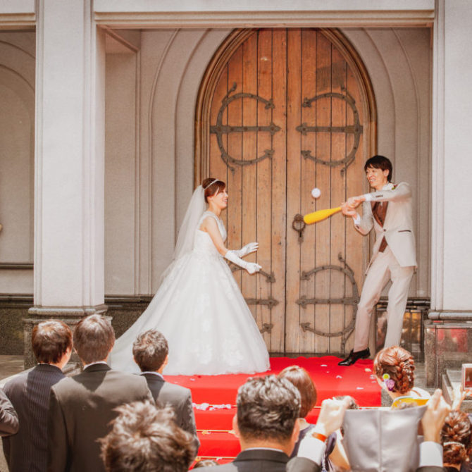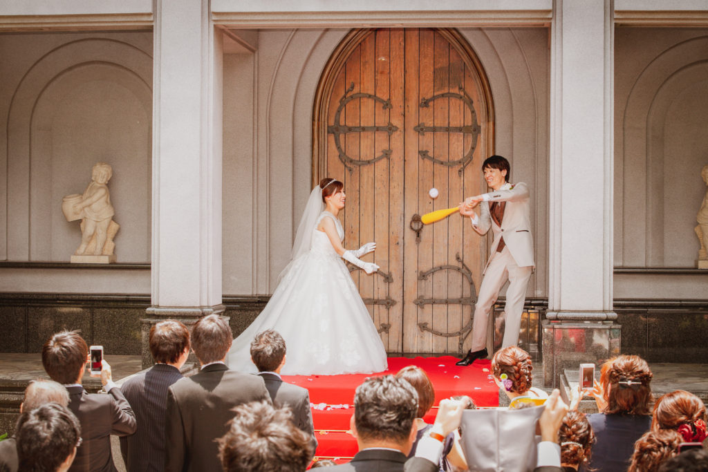 ゲストが喜んでくれる結婚式にしたかったので、ゲームやサプライズを色々用意し、ゲストととても距離が近い式になりました。また、ブーケトスやブロッコリートスは人が限られてしまうので、野球ボールトスで全員参加してもらい、ボールを取った人にプレゼントをあげ、様々なゲームをして皆が楽しめる結婚式にしました。