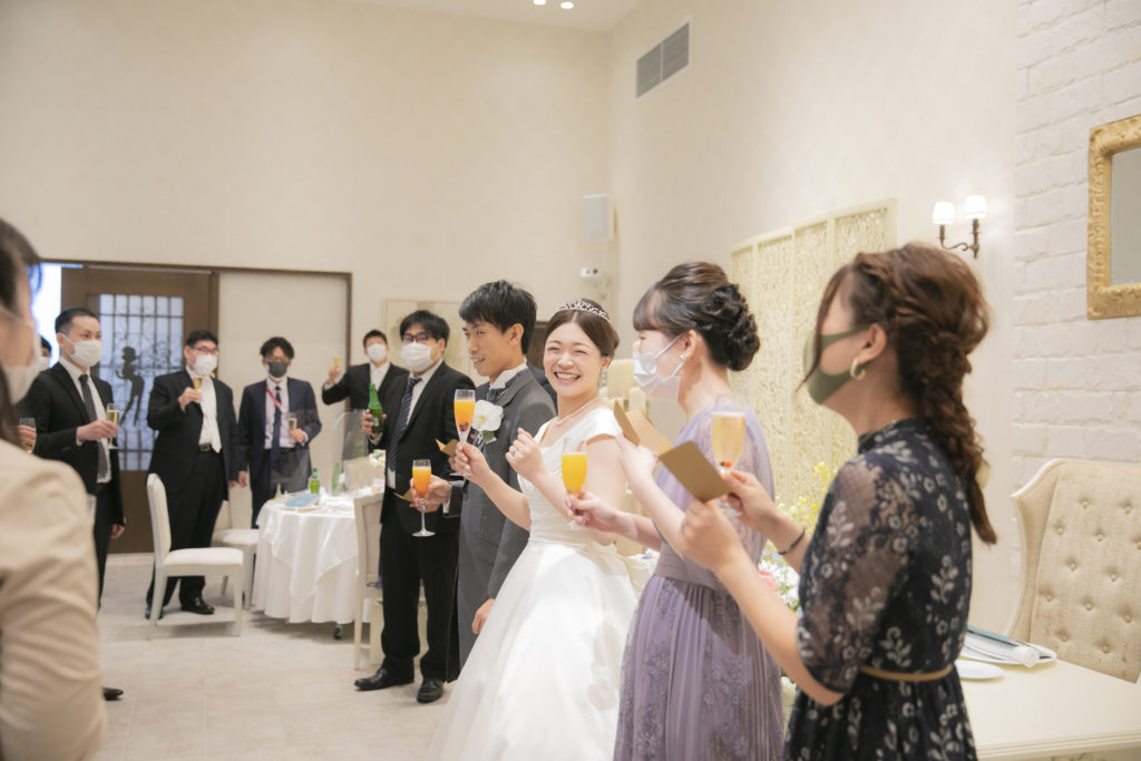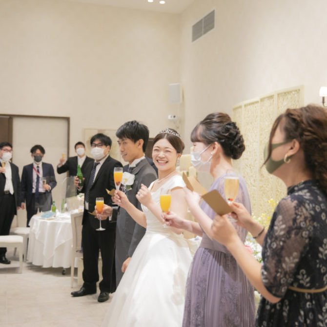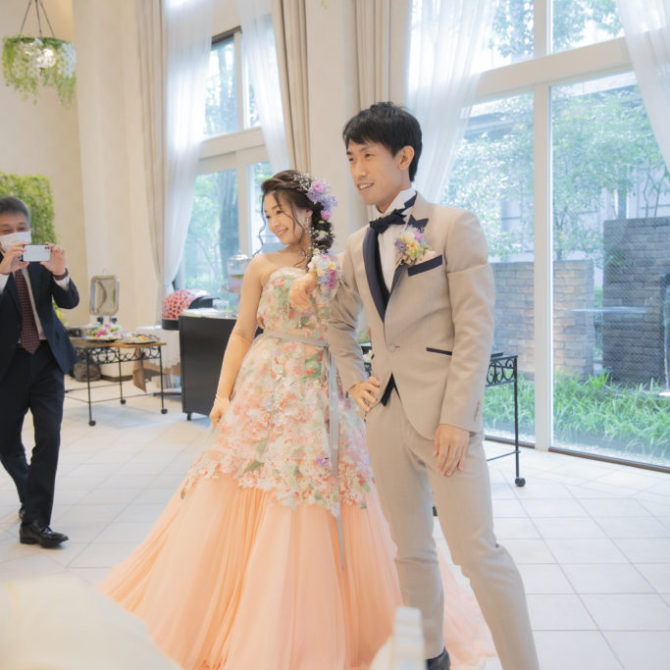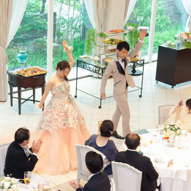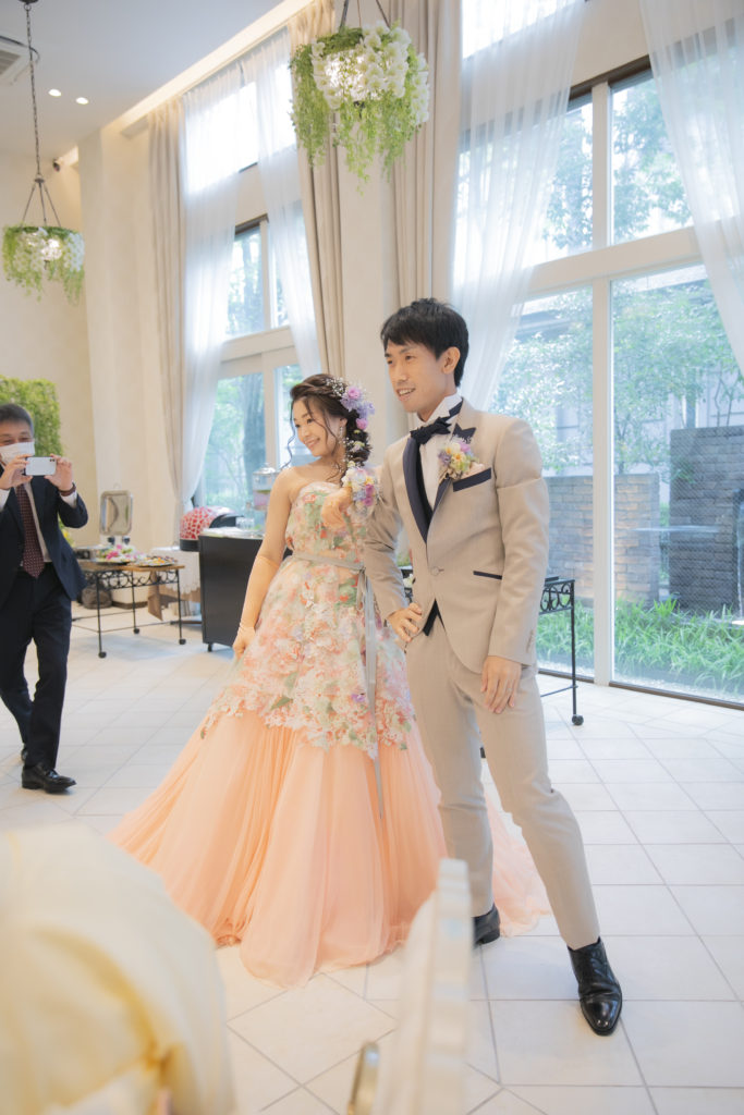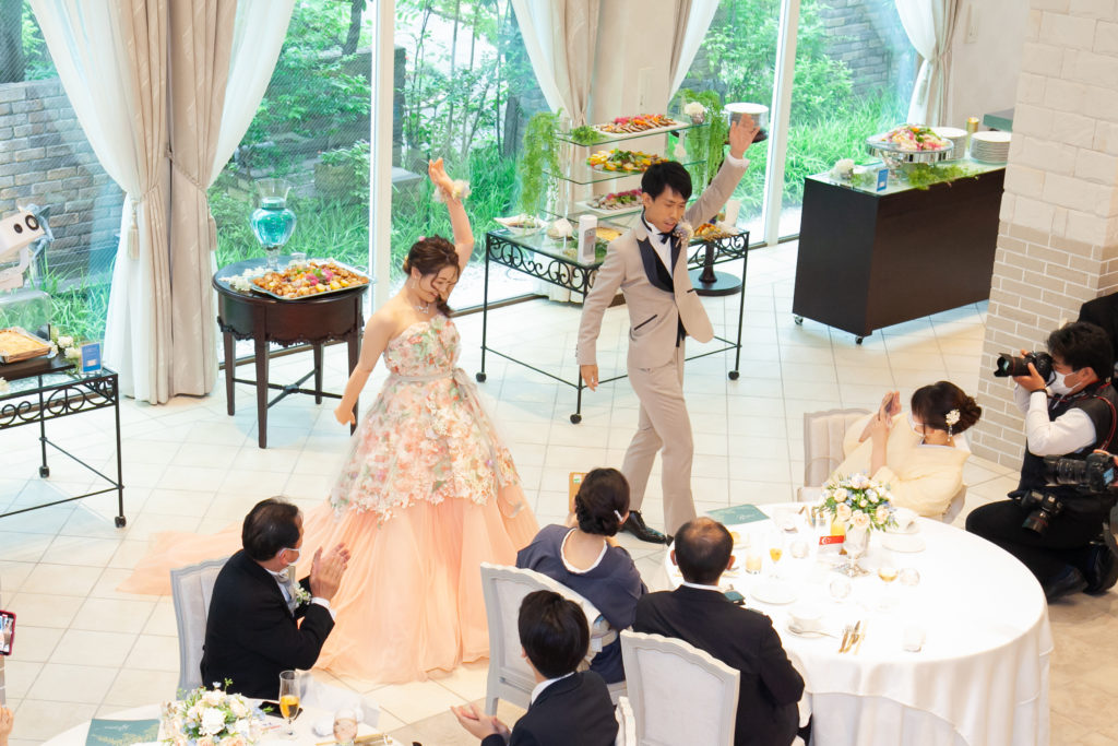 お色直し入場後には、おふたりによるサプライズダンスのご披露!この日のためにと練習をされてきたおふたり。会場の皆さんも手拍子をしながら、おふたりを見守っていらっしゃいました。お開き後にはご友人からのアンコールも!様々な場面でご両家の一体感が感じられる、和気あいあいとした1日になりましたね。