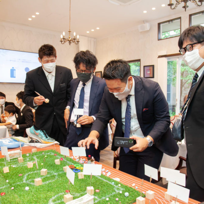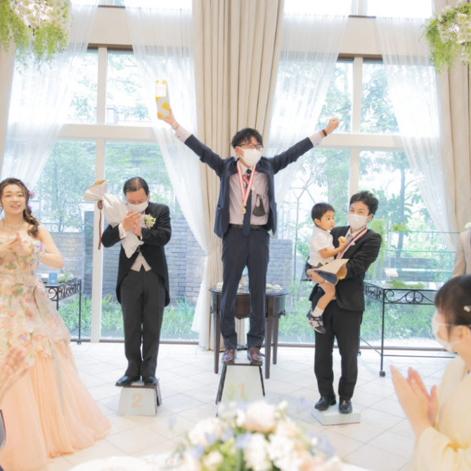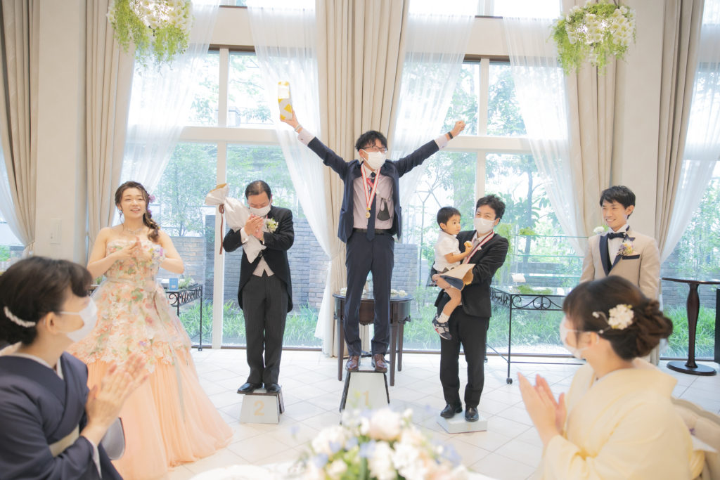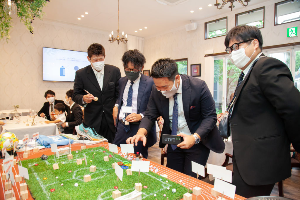 感動の挙式のあとは、サッカーの選手入場曲でパーティスタート!まずは雄哉さん、未紗さんによる選手宣誓。そして、聖火台をイメージしたキャンドルに明かりを灯し、オリンピックの開会式さながらの雰囲気でした。会場全体が盛り上がったところで、雄哉さんのサポーター仲間や、未紗さんのご友人に参加して頂き、言葉をつないでいくリレー形式の乾杯を行いました。さらに、全員参加型の名刺交換ゲームでは、楽しそうな会話が飛び交い、両家の交流が深まる素敵な時間になりましたね。上位3名の方には、オリンピックになぞらえてオリジナルの金・銀・銅メダルと、おふたり選りすぐりのスポーツグッズをプレゼント!