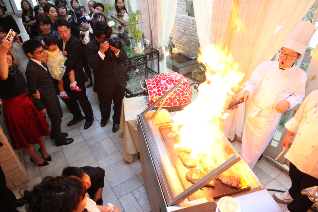 新郎様が、実際にコックコートを着てシェフに扮し、サプライズで自らフランべもできます。