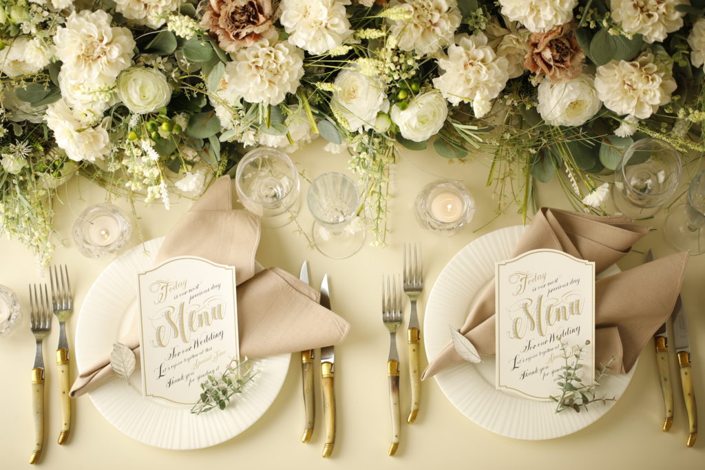 セレクトしたテーブルクロスやコーディネートにも併せてお皿のデザインもご提案していますので、おふたりの想い描かれる会場の雰囲気に寄り添ったコーディネートをご提案いたします。